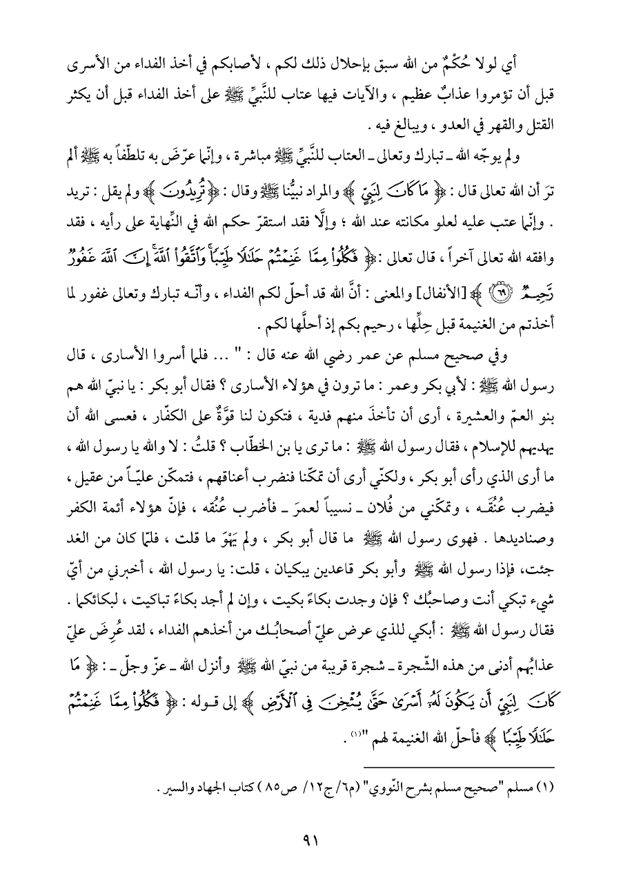 وفي صحيح مسلم عن عمر رضي الله عنه قال: " ... فلما أسروا الأسارى، قال رسول الله - صلى الله عليه وسلم -: لأبي بكر وعمر: ما ترون في هؤلاء الأسارى؟ فقال أبو بكر: يا نبيّ الله هم بنو العمّ والعشيرة، أرى أن تأخذَ منهم فدية، فتكون لنا قوَّةٌ على الكفّار، فعسى الله أن يهديهم للإسلام، فقال رسول الله - صلى الله عليه وسلم -: ما ترى يا بن الخطّاب؟ قلتُ: لا والله يا رسول الله، ما أرى الذي رأى أبو بكر، ولكنّي أرى أن تمكّنا فنضرب أعناقهم، فتمكّن عليّاً من عقيل، فيضرب عُنُقَه، وتمكّني من فُلان ـ نسيباً لعمرَ ـ فأضرب عُنُقه، فإنّ هؤلاء أئمة الكفر وصناديدها. فهوى رسول الله - صلى الله عليه وسلم - ما قال أبو بكر، ولم يَهْوَ ما قلت، فلمّا كان من الغد جئت، فإذا رسول الله - صلى الله عليه وسلم - وأبو بكر قاعدين يبكيان، قلت: يا رسول الله، أخبرني من أيّ شيء تبكي أنت وصاحبُك؟ فإن وجدت بكاءً بكيت، وإن لم أجد بكاءً تباكيت، لبكائكما. فقال رسول الله - صلى الله عليه وسلم -: أبكي للذي عرض عليّ أصحابُك من أخذهم الفداء، لقد عُرِضَ عليّ عذابُهم أدنى من هذه الشّجرة ـ شجرة قريبة من نبيّ الله - صلى الله عليه وسلم - وأنزل الله ـ عزّ وجلّ ـ: {مَا كَانَ لِنَبِيٍّ أَنْ يَكُونَ لَهُ أَسْرَى حَتَّى يُثْخِنَ فِي الْأَرْضِ} إلى قوله: {فَكُلُوا مِمَّا غَنِمْتُمْ حَلَالًا طَيِّبًا} فأحلّ الله الغنيمة لهم " (¬١).