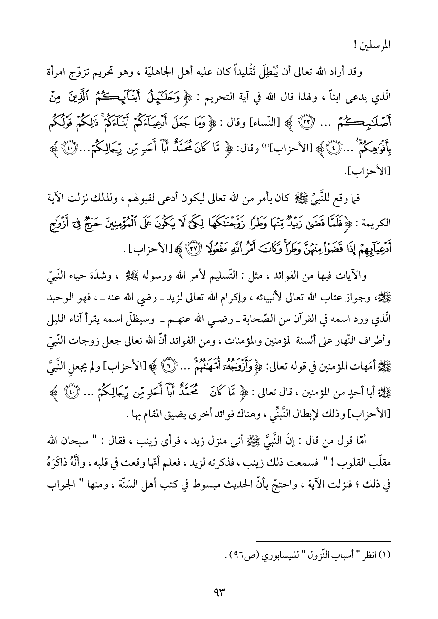 وقد أراد الله تعالى أن يُبْطِلَ تَقْليداً كان عليه أهل الجاهليّة، وهو تحريم تزوّج امرأة الّذي يدعى ابناً، ولهذا قال الله في آية التحريم: {وَحَلَائِلُ أَبْنَائِكُمُ الَّذِينَ مِنْ أَصْلَابِكُمْ ... (٢٣)} [النّساء] وقال: {وَمَا جَعَلَ أَدْعِيَاءَكُمْ أَبْنَاءَكُمْ ذَلِكُمْ قَوْلُكُمْ بِأَفْوَاهِكُمْ ... (٤)} [الأحزاب] (¬١) وقال: {مَا كَانَ مُحَمَّدٌ أَبَا أَحَدٍ مِنْ رِجَالِكُمْ ... (٤٠)} [الأحزاب].