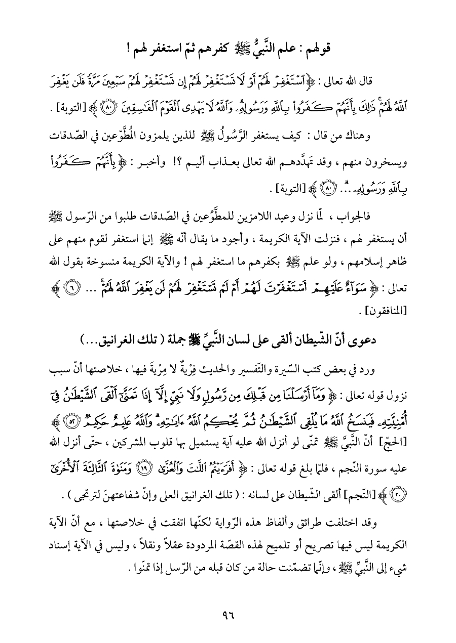 ورد في بعض كتب السّيرة والتّفسير والحديث فِرْيةٌ لا مِرْيةَ فيها، خلاصتها أنّ سبب نزول قوله تعالى: {وَمَا أَرْسَلْنَا مِنْ قَبْلِكَ مِنْ رَسُولٍ وَلَا نَبِيٍّ إِلَّا إِذَا تَمَنَّى أَلْقَى الشَّيْطَانُ فِي أُمْنِيَّتِهِ فَيَنْسَخُ اللَّهُ مَا يُلْقِي الشَّيْطَانُ ثُمَّ يُحْكِمُ اللَّهُ آيَاتِهِ وَاللَّهُ عَلِيمٌ حَكِيمٌ (٥٢)} [الحجّ] أنّ النَّبيَّ - صلى الله عليه وسلم - تمنّى لو أنزل الله عليه آية يستميل بها قلوب المشركين، حتّى أنزل الله عليه سورة النّجم، فلمّا بلغ قوله تعالى: {أَفَرَأَيْتُمُ اللَّاتَ وَالْعُزَّى (١٩) وَمَنَاةَ الثَّالِثَةَ الْأُخْرَى (٢٠)} [النّجم] ألقى الشّيطان على لسانه: (تلك الغرانيق العلى وإنّ شفاعتهنّ لترتجى).
