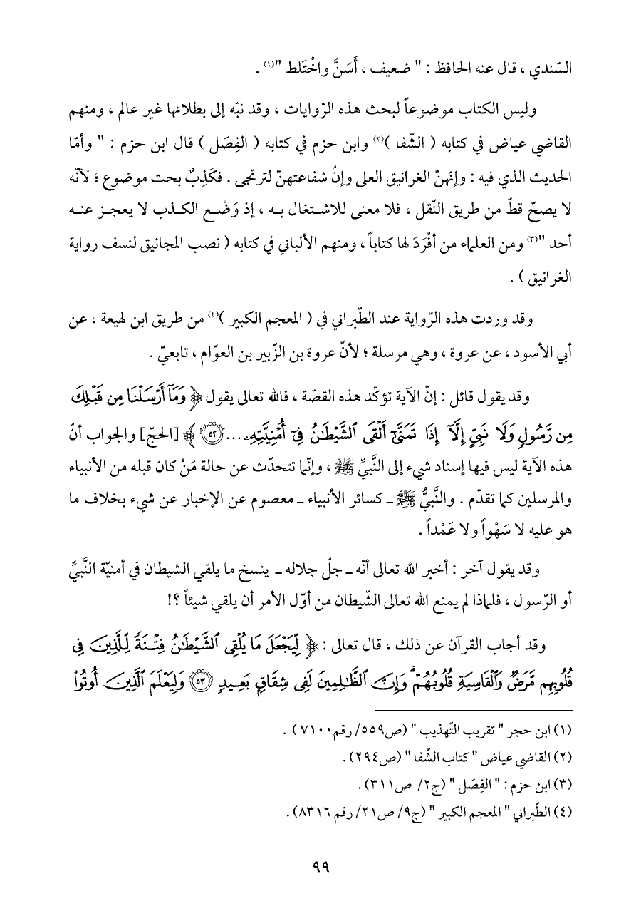 وليس الكتاب موضوعاً لبحث هذه الرّوايات، وقد نبّه إلى بطلانها غير عالم، ومنهم القاضي عياض في كتابه (الشّفا) (¬٢) وابن حزم في كتابه (الفِصَل) قال ابن حزم: " وأمّا الحديث الذي فيه: وإنّهنّ الغرانيق العلى وإنّ شفاعتهنّ لترتجى. فكَذِبٌ بحت موضوع؛ لأنّه لا يصحّ قطّ من طريق النّقل، فلا معنى للاشتغال به، إذ وَضْع الكذب لا يعجز عنه أحد " (¬٣) ومن العلماء من أفْرَدَ لها كتاباً، ومنهم الألباني في كتابه (نصب المجانيق لنسف رواية الغرانيق).