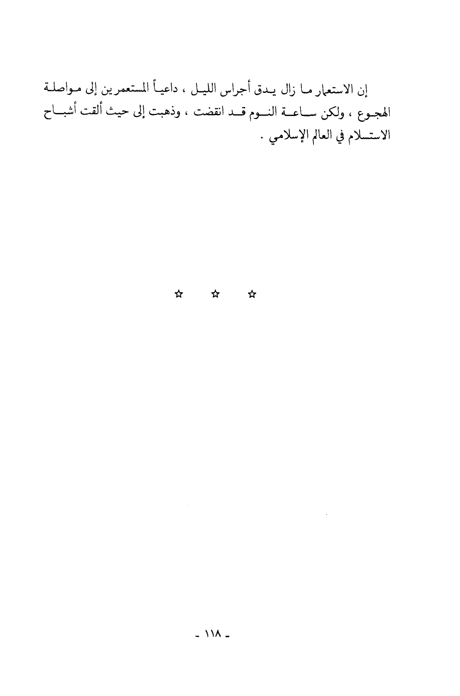 إن الاستعمار ما زال يدق أجراس الليل، داعياً المستعمرين إلى مواصلة الهجوع، ولكن ساعة النوم قد انقضت، وذهبت إلى حيث ألقت أشباح الاستسلام في العالم الإسلامي.