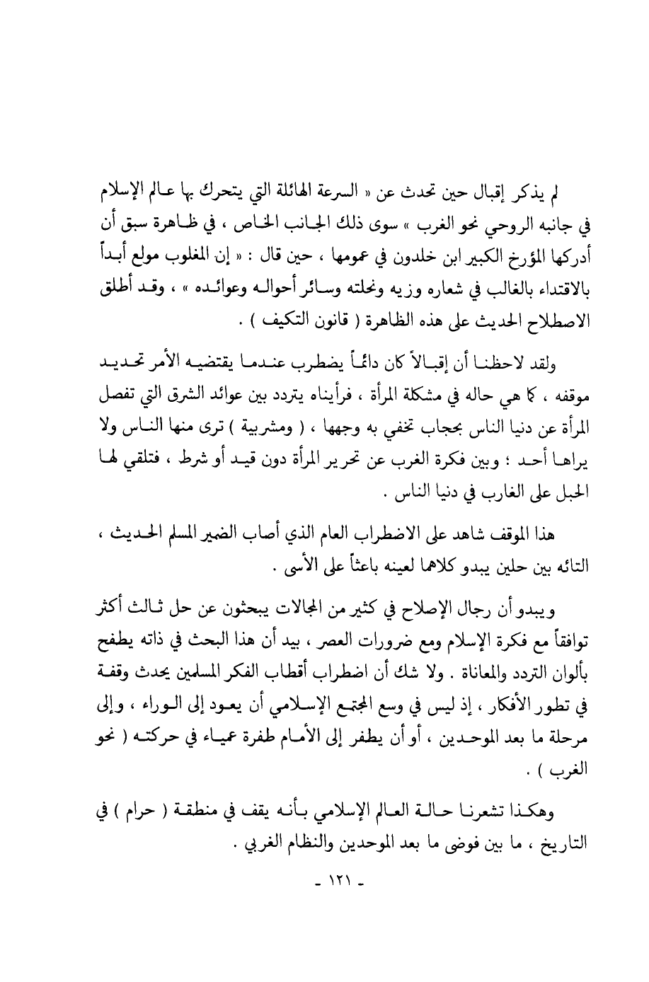 ويبدو أن رجال الإصلاح في كثير من المجالات يبحثون عن حل ثالث أكثر توافقاً مع فكرة الإسلام ومع ضرورات العصر، بيد أن هذا البحث في ذاته يطفح بألوان التردد والمعاناة. ولا شك أن اضطراب أقطاب الفكر المسلمين يحدث وقفة في تطور الأفكار، إذ ليس في وسع المجتمع الإسلامي أن يعود إلى الوراء، وإلى مرحلة ما بعد الموحدين، أو أن يطفر إلى الأمام طفرة عمياء في حركته (نحو الغرب).