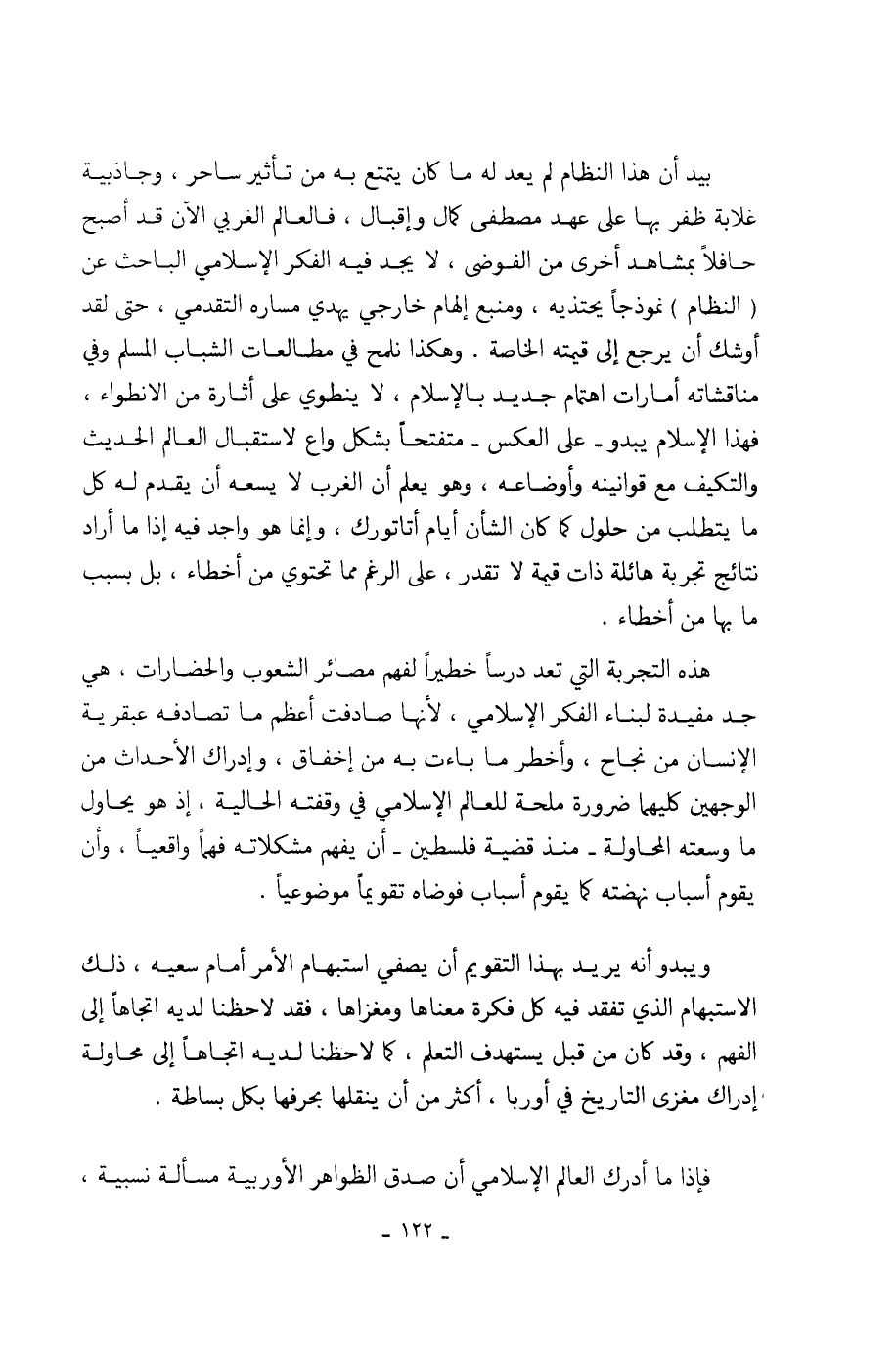 بيد أن هذا النظام لم يعد له ما كان يتمتع به من تأثير ساحر، وجاذبية غلابة ظفر بها على عهد مصطفى كمال وإقبال، فالعالم الغربي الآن قد أصبح حافلاً بمشاهد أخرى من الفوضى، لا يجد فيه الفكر الإسلامي الباحث عن (النظام) نموذجاً يحتذيه، ومنبع إلهام خارجي يهدي مساره التقدمي، حتى لقد أوشك أن يرجع إلى قيمته الخاصة. وهكذا نلمح في مطالعات الشباب المسلم وفي مناقشاته أمارات اهتمام جديد بالإسلام، لا ينطوي على أثارة من الانطواء، فهذا الإسلام يبدو- على العكس- متفتحاً بشكل واع لاستقبال العالم الحديث والتكيف مع قوانينه وأوضاعه، وهو يعلم أن الغرب لا يسعه أن يقدم له كل ما يتطلب من حلول كما كان الشأن أيام أتاتورك، وإنما هو واجد فيه إذا ما أراد نتائج تجربة هائلة ذات قيمة لا تقدر، على الرغم مما تحتوي من أخطاء، بل بسبب ما بها من أخطاء.