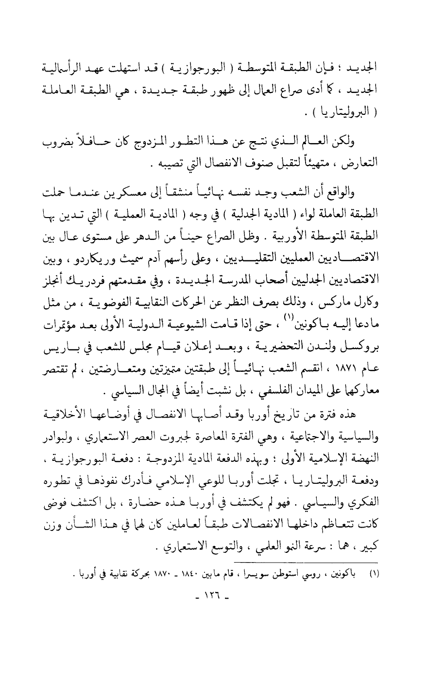 هذه فترة من تاريخ أوربا وقد أصابها الانفصال في أوضاعها الأخلاقية والسياسية والاجتماعية، وهي الفترة المعاصرة لجبروت العصر الاستعماري، ولبوادر النهضة الإسلامية الأولى؛ وبهذه الدفعة المادية المزدوجة: دفعة البورجوازية، ودفعة البروليتاريا، تجلت أوربا للوعي الإسلامي فأدرك نفوذها في تطوره الفكري والسياسي. فهو لم يكتشف في أوربا هذه حضارة، بل أكتشف فوضى كانت تتعاظم داخلها الانفصالات طبقاً لعاملين كان لهما في هذا الشأن وزن كبير، هما: سرعة النمو العلمي، والتوسع الاستعماري.