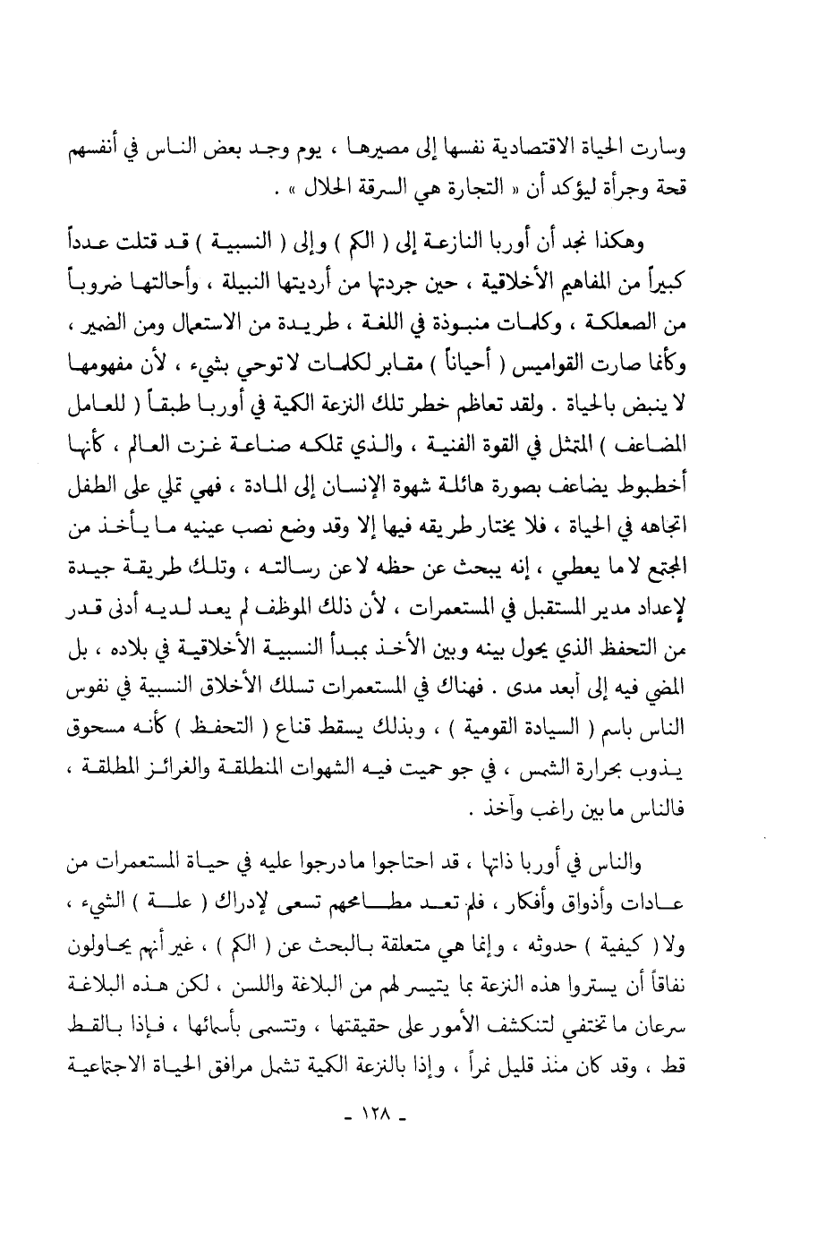 والناس في أوربا ذاتها، قد احتاجوا ما درجوا عليه في حياة المستعمرات من عادات وأذواق وأفكار، فلم تعد مطامحهم تسعى لإدراك (علة) الشيء، ولا (كيفية) حدوثه، وإنما هي متعلقة بالبحث عن (الكم)، غير أنهم يحاولون نفاقاً أن يستروا هذه النزعة بما يتيسر لهم من البلاغة واللسن، لكن هذه البلاغة سرعان ما تختفي لتنكشف الأمور على حقيقتها، وتتسمى بأسمائها، فإذا بالقط قط، وقد كان منذ قليل نمراً، وإذا بالنزعة الكمية تشمل مرافق الحياة الاجتماعية