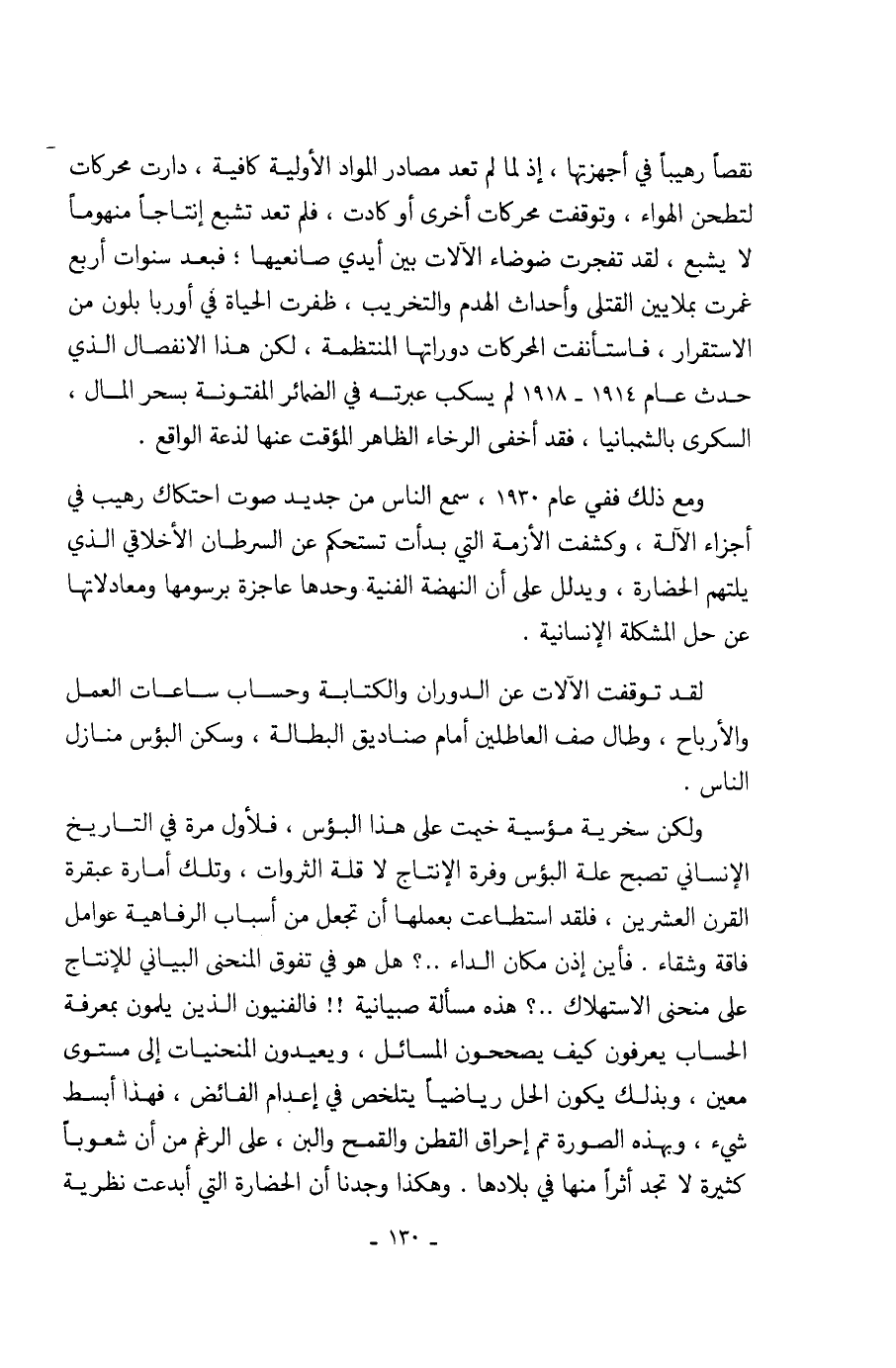 نقصاً رهيباً في أجهزتها، إذ لما لم تعد مصادر المواد الأولية كافية، دارت محركات لتطحن الهواء، وتوقفت محركات أخرى أو كادت، فلم تعد تشبع إنتاجاً منهوماً لا يشبع، لقد تفجرت ضوضاء الآلات بين أيدي صانعيها؛ فبعد سنوات أربع غمرت بملايين القتلى وأحداث الهدم والتخريب، ظفرت الحياة في أوربا بلون من الاستقرار، فاستأنفت المحركات دوراتها المنتظمة، لكن هذا الانفصال الذي حدث عام 1914 - 1918 لم يسكب عبرته في الضمائر المفتونة بسحر المال، السكرى بالشمبانيا، فقد أخفى الرخاء الظاهر المؤقت عنها لذعة الواقع.