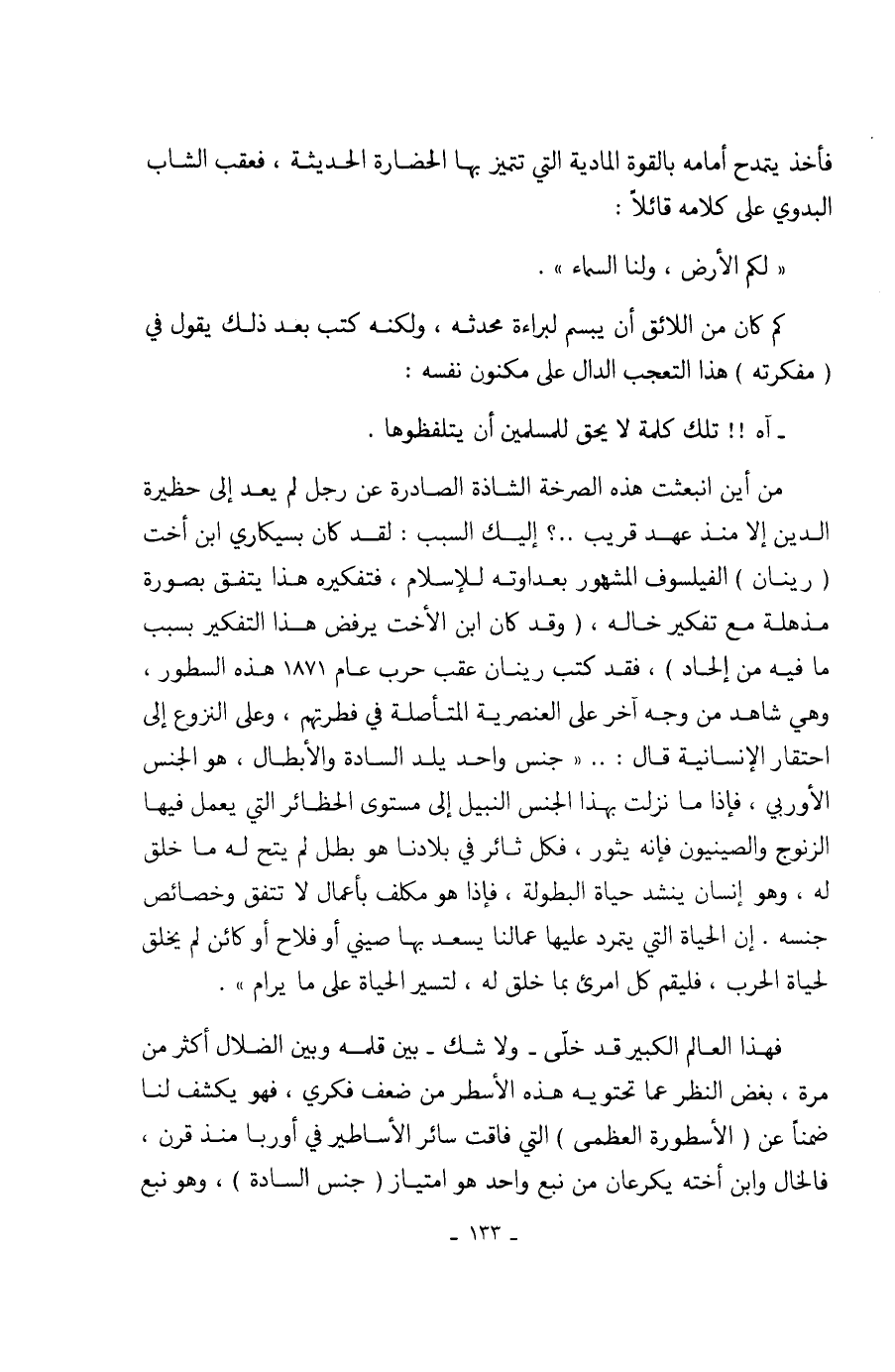 فهذا العالم الكبير قد خلّى- ولا شك- بين قلمه وبين الضلال أكثر من مرة، بغض النظر عما تحتويه هذه الأسطر من ضعف فكري، فهو يكشف لنا ضمناً عن (الأسطورة العظمى) التي فاقت سائر الأساطير في أوربا منذ قرن، فالخال وابن أخته يكرعان من نبع واحد هو امتياز (جنس السادة)، وهو نبع