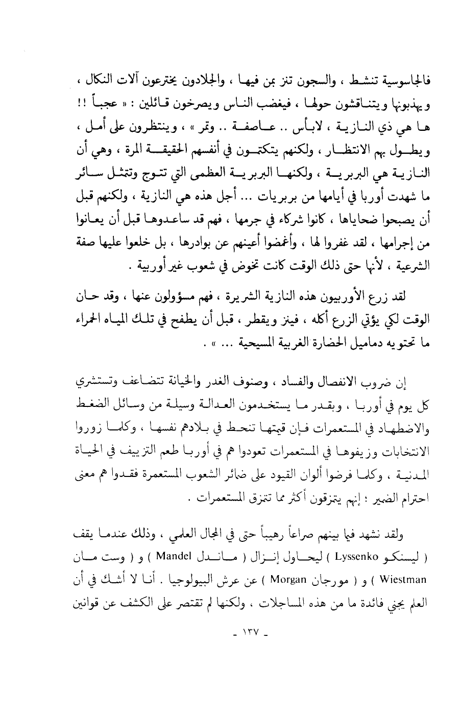 ولقد نشهد فيما بينهم صراعاً رهيباً حتى في المجال العلمي، وذلك عندما يقف (ليسنكو Lyssenko) ليحاول إنزال (ماندل Mandel) و (وست مان Wiestman) و (مورجان Morgan) عن عرش البيولوجيا. أنا لا أشك في أن العلم يجني فائدة ما من هذه المساجلات، ولكنها لم تقتصر على الكشف عن قوانين