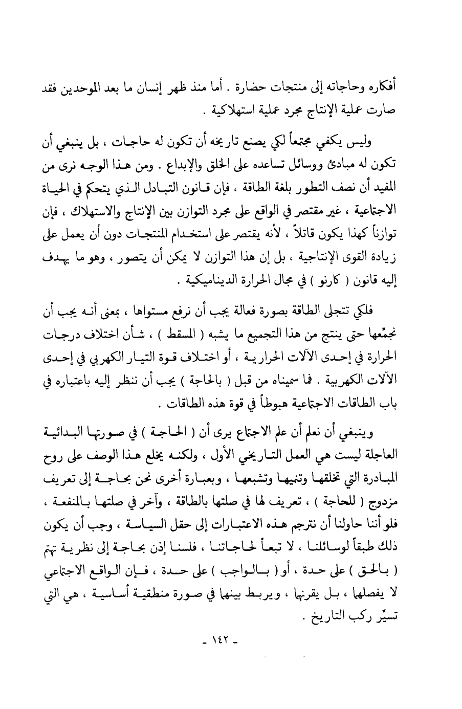 وليس يكفي مجتمعاً لكي يصنع تاريخه أن تكون له حاجات، بل ينبغي أن تكون له مبادئ ووسائل تساعده على الخلق والإبداع. ومن هذا الوجه نرى من المفيد أن نصف التطور بلغة الطاقة، فإن قانون التبادل الذي يتحكم في الحياة الاجتماعية، غير مقتصر في الواقع على مجرد التوازن بين الإنتاج والاستهلاك، فإن توازناً كهذا يكون قاتلاً، لأنه يقتصر على استخدام المنتجات دون أن يعمل على زيادة القوى الإنتاجية، بل إن هذا التوازن لا يمكن أن يتصور، وهو ما يهدف إليه قانون (كارنو) في مجال الحرارة الديناميكية.
