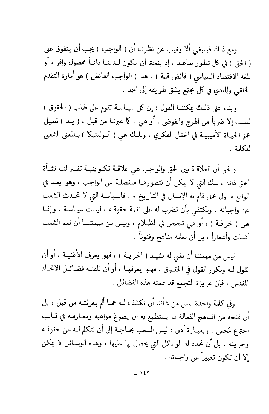 ومع ذلك فينبغي ألا يغيب عن نظرنا أن (الواجب) يجب أن يتفوق على (الحق) في كل تطور صاعد، إذ يتحتم أن يكون لدينا دائماً محصول وافر، أو بلغة الاقتصاد السياسي (فائض قيمة). هذا (الواجب الفائض) هو أمارة التقدم الخلقي والمادي في كل مجتمع يشق طريقه إلى المجد.