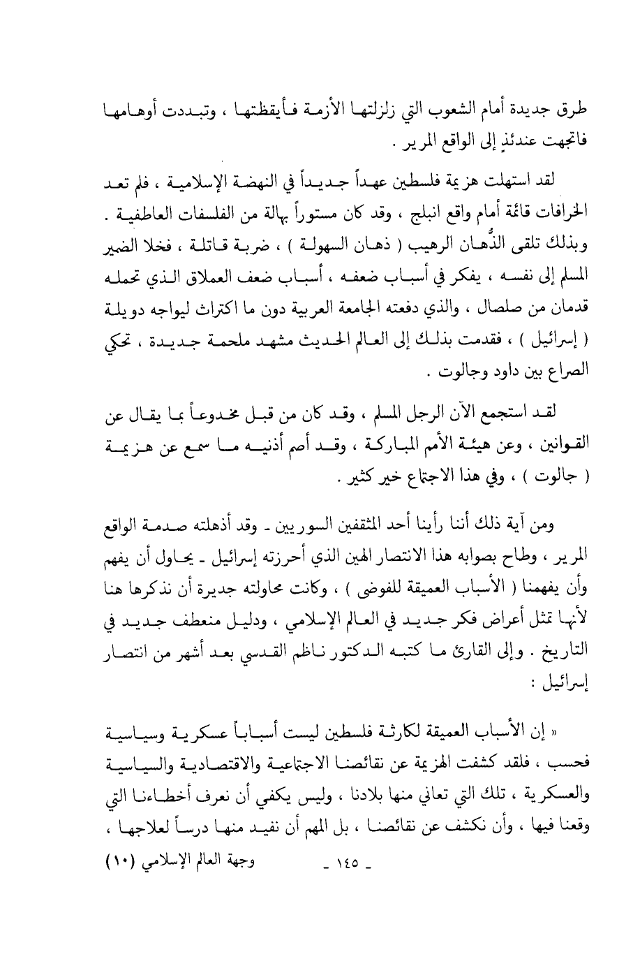ومن آية ذلك أننا رأينا أحد المثقفين السوريين- وقد أذهلته صدمة الواقع المرير، وطاح بصوابه هذا الانتصار المهين الذي أحرزته إسرائيل- يحاول أن يفهم وأن يفهمنا (الأسباب العميقة للفوضى)، وكانت محاولته جديرة أن نذكرها هنا لأنها تمثل أعراض فكر جديد في العالم الإسلامي، ودليل منعطف جديد في التاريخ. وإلى القارئ ما كتبه الدكتور ناظم القدسي بعد أشهر من انتصار إسرائيل: