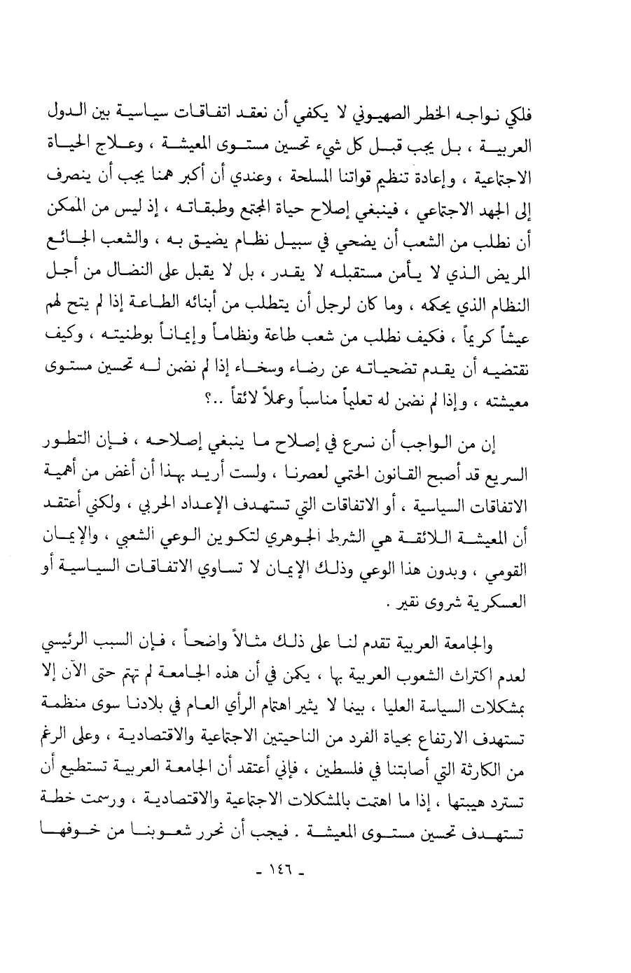 فلكي نواجه الخطر الصهيوني لا يكفي أن نعقد اتفاقات سياسية بين الدول العربية، بل يجب قبل كل شيء تحسين مستوى المعيشة، وعلاج الحياة الاجتماعية، وإعادة تنظيم قواتنا المسلحة، وعندي أن أكبر همنا يجب أن ينصرف إلى الجهد الاجتماعي، فينبغي إصلاح حياة المجتمع وطبقاته، إذ ليس من الممكن أن نطلب من الشعب أن يضحي في سبيل نظام يضيق به، والشعب الجائع المريض الذي لا يأمن مستقبله لا يقدر، بل لا يقبل على النضال من أجل النظام الذي يحكمه، وما كان لرجل أن يتطلب من أبنائه الطاعة إذا لم يتح لهم عيشاً كريماً، فكيف نطلب من شعب طاعة ونظاماً وإيماناً بوطنيته، وكيف نقتضيه أن يقدم تضحياته عن رضاء وسخاء إذا لم نضمن له تحسين مستوى معيشته، وإذا لم نضمن له تعليماً مناسباً وعملاً لائقاً .. ؟