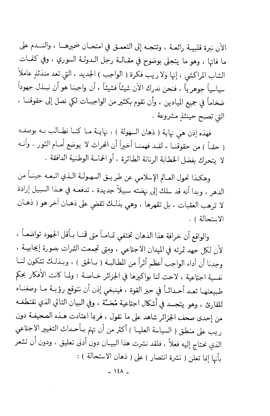 الآن نبرة قلبية رائعة، وتتجه إلى التعمق في امتحان ضميرها، والندم على ما فاتها، وهو ما يتجلى بوضوح في مقالة رجل الدولة السوري، وفي كلمات الشاب المراكشي، إنها ولا ريب فكرة (الواجب) الجديد، التي تعد منذئذٍ عاملاً سياسياً جوهرياً، فنحن ندرك الآن شيئاً فشيئاً، أن واجبنا هو أن نبذل جهوداً ضخاماً في جميع الميادين، وأن نقوم بكثير من الواجبات لكي نصل إلى حقوقنا، التي تصبح حينئذٍ مشروعة.