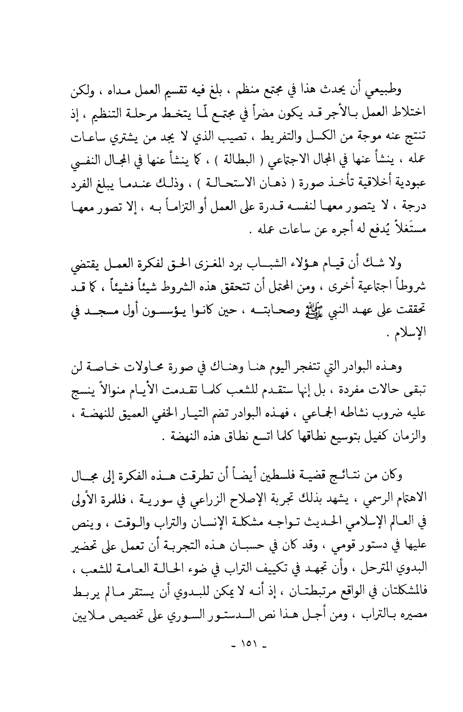 ولا شك أن قيام هؤلاء الشباب برد المغزى الحق لفكرة العمل يقتضي شروطاً اجتماعية أخرى، ومن المحتمل أن تتحقق هذه الشروط شيئاً فشيئاً، كما قد تحققت على عهدالنبي - صلى الله عليه وسلم - وصحابته، حين كانوا يؤسسون أول مسجد في الإسلام.