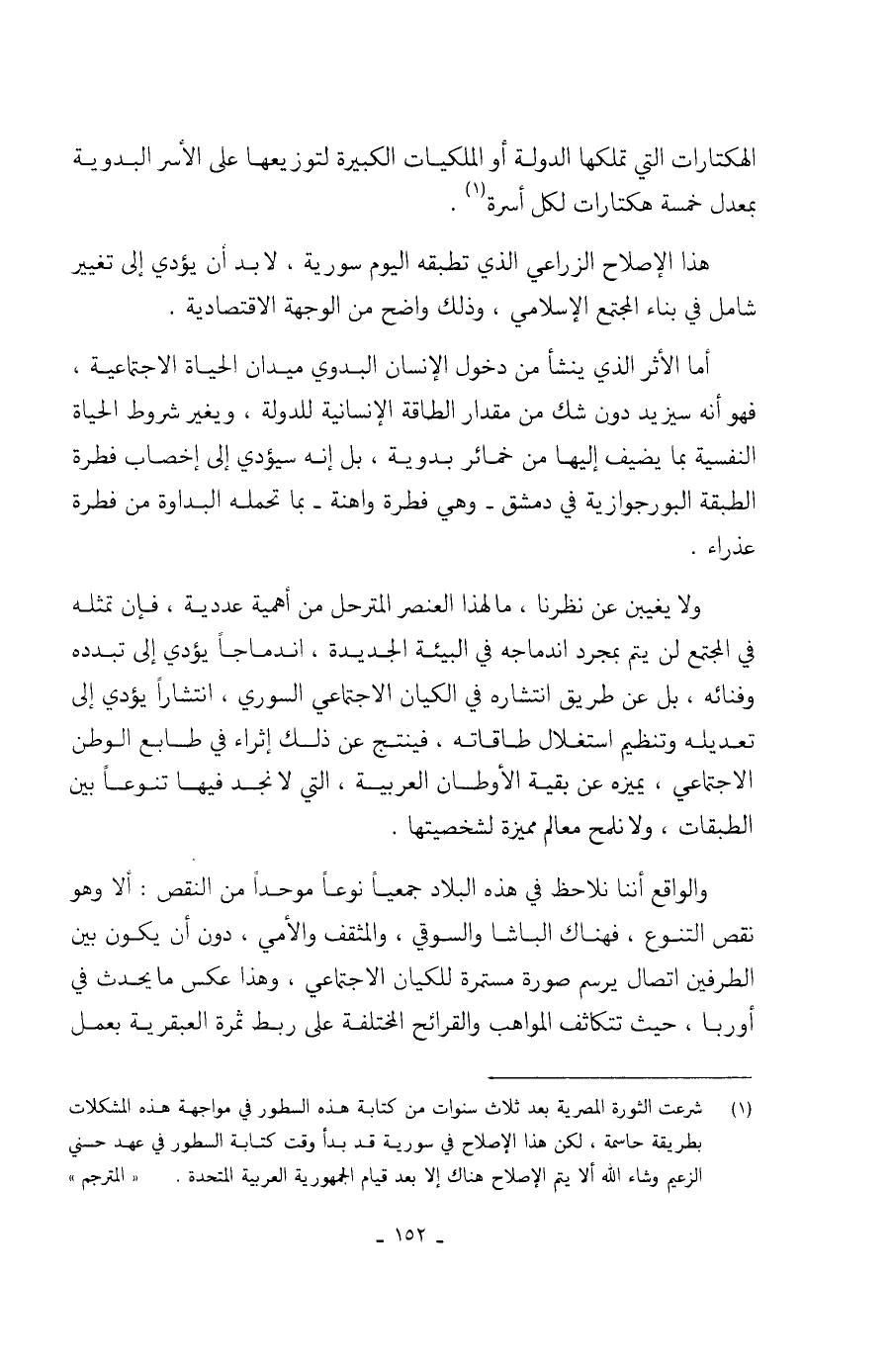 (¬1) شرعت الثورة المصرية بعد ثلاث سنوات من كتابة هذه السطور في مواجهة هذه المشكلات بطريقة حاسمة، لكن هذا الإصلاح في سورية قد بدأ وقت كتابة السطور في عهد حسني الزعيم وشاء الله ألا يتم الإصلاح هناك إلا بعد قيام الجمهورية العربية المتحدة. ((المترجم)).