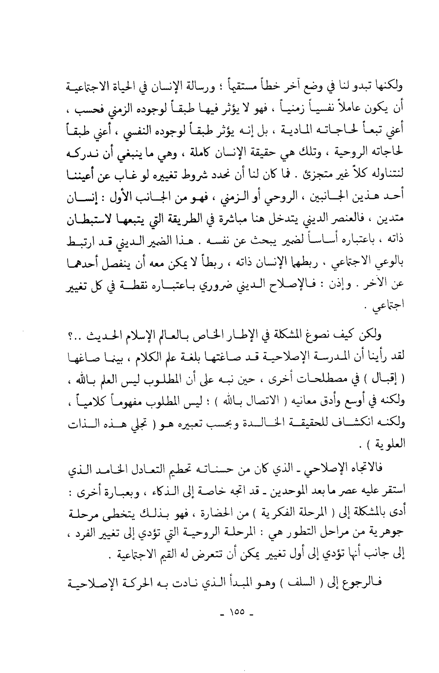 ولكنها تبدو لنا في وضع آخر خطاً مستقيماً؛ ورسالة الإنسان في الحياة الاجتماعية أن يكون عاملاً نفسياً زمنياً، فهو لا يؤثر فيها طبقاً لوجوده الزمني فحسب، أعني تبعاً لحاجاته المادية، بل إنه يؤثر طبقاً لوجوده النفسي، أعني طبقاً لحاجاته الروحية، وتلك هي حقيقة الإنسان كاملة، وهي ما ينبغي أن ندركه لنتناوله كلاً غير متجزئ. فما كان لنا أن نحدد شروط تغييره لو غاب عن أعيننا أحد هذين الجانبين، الروحي أو الزمني، فهو من الجانب الأول: إنسان متدين، فالعنصر الديني يتدخل هنا مباشرة في الطريقة التي يتبعها لاستبطان ذاته، باعتباره أساساً لضمير يبحث عن نفسه. هذا الضمير الديني قد ارتبط بالوعي الاجتماعي، ربطهما الإنسان ذاته، ربطاً لا يمكن معه أن ينفصل أحدهما عن الآخر. وإذن: فالإصلاح الديني ضروري باعتباره نقطة في كل تغيير اجتماعي.