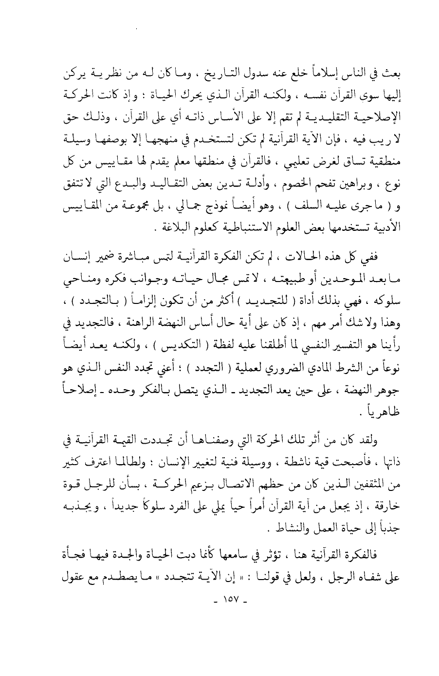 بعث في الناس إسلاماً خلع عنه سدول التاريخ، وما كان له من نظرية يركن إليها سوى القرآن نفسه، ولكنه القرآن الذي يحرك الحياة؛ وإذ كانت الحركة الإصلاحية التقليدية لم تقم إلا على الأساس ذاته أي على القرآن، وذلك حق لاريب فيه، فإن الآية القرآنية لم تكن لتستخدم في منهجها إلا بوصفها وسيلة منطقية تساق لغرض تعليمي، فالقرآن في منطقها معلم يقدم لها مقاييس من كل نوع، وبراهين تفحم الخصوم، وأدلة تدين بعض التقاليد والبدع التي لا تتفق و (ما جرى عليه السلف)، وهو أيضاً نموذج جمالي، بل مجموعة من المقاييس الأدبية تستخدمها بعض العلوم الاستنباطية كعلوم البلاغة.