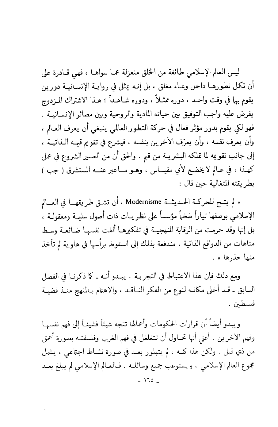 ((لم يتح للحركة الحديثة Modernisme، أن تشق طريقها في العالم الإسلامي بوصفها تياراً ضخماً مؤسساً على نظريات ذات أصول سليمة ومعقولة، بل إنها وقد حرمت من الرقابة المنهجية في تفكيرها ألفت نفسها ضائعة وسط متاهات من الدوافع الذاتية، مندفعة بذلك إلى السقوط برأسها في هاوية لم تأخذ منها حذرها)).