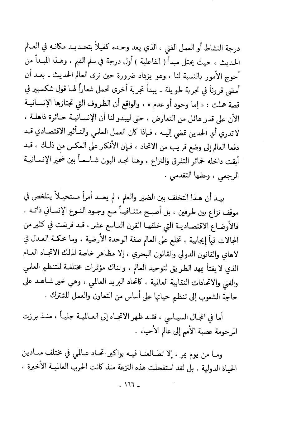 درجة النشاط أو العمل الفني، الذي يعد وحده كفيلاً بتحديد مكانه في العالم الحديث، حيث يحتل مبدأ (الفاعلية) أول درجة في سلم القيم، وهذا المبدأ من أحوج الأمور بالنسبة لنا، وهو يزداد ضرورة حين نرى العالم الحديث- بعد أن أمضى قروناً في تجربة طويلة- يبدأ تجربة أخرى تحمل شعاراً لها قول شكسبير في قصة هملت: ((إما وجود أو عدم))، والواقع أن الظروف التي تجتازها الإنسانية الآن على قدر هائل من التعارض، حتى ليبدو لنا أن الإنسانية حائرة ذاهلة، لا تدري أي الحدين تمضي إليه، فإذا كان العمل العلمي والتأثير الاقتصادي قد دفعا العالم إلى وضع قريب من الاتحاد، فإن الأفكار على العكس من ذلك، قد أبقت داخله خمائر التفرق والنزاع، وهنا نجد البون شاسعاً بين ضمير الإنسانية الرجعي، وعلمها التقدمي.