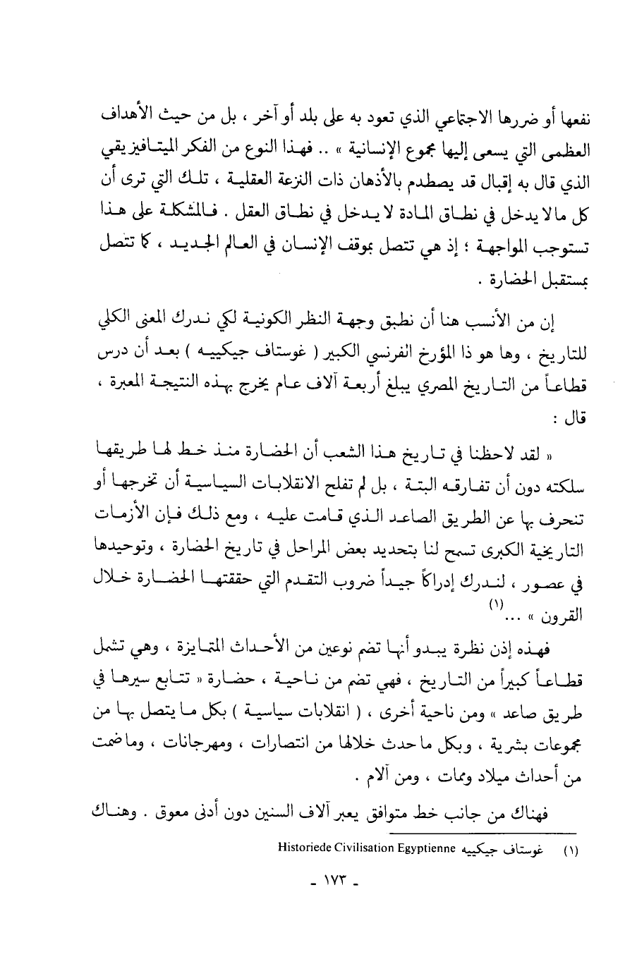 إن من الأنسب هنا أن نطبق وجهة النظر الكونية لكي ندرك المعنى الكلي للتاريخ، وها هو ذا المؤرخ الفرنسي الكبير (غوستاف جيكييه) بعد أن درس قطاعاً من التاريخ المصري يبلغ أربعة آلاف عام يخرج بهذه النتيجة المعبرة، قال: