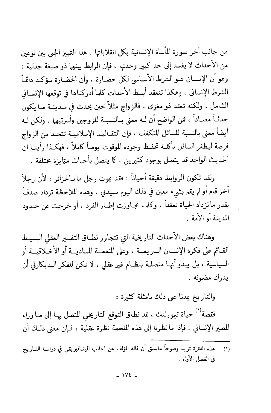 (¬1) هذه الفقرة تزيد وضوحاً ما سبق أن قاله المؤلف عن الجانب الميتافيزيقي في دراسة التاريخ في الفصل الأول.