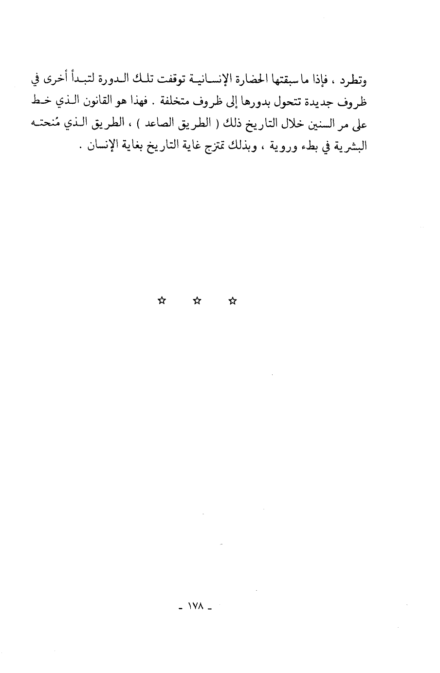 وتطرد، فإذا ما سبقتها الحضارة الإنسانية توقفت تلك الدورة لتبدأ أخرى في ظروف جديدة تتحول بدورها إلى ظروف متخلفة. فهذا هو القانون الذي خط على مر السنين خلال التاريخ ذلك (الطريق الصاعد)، الطريق الذي مُنحته البشرية في بطء وروية، وبذلك تمتزج غاية التاريخ بغاية الإنسان.