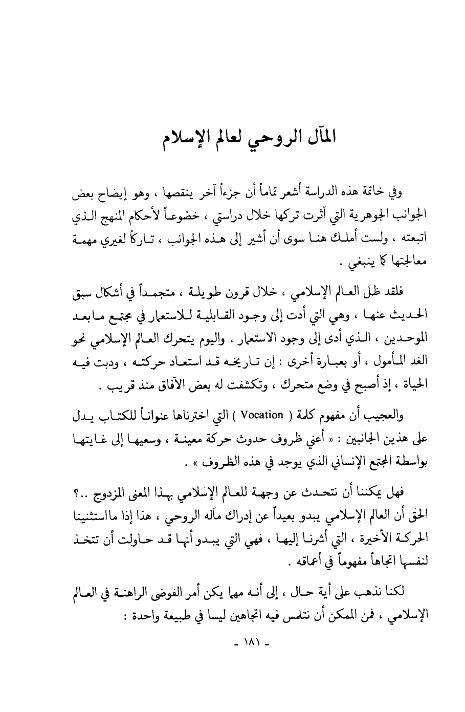 الحق أن العالم الإسلامي يبدو بعيداً عن إدراك مآله الروحي، هذا إذا ما استثنينا الحركة الأخيرة، التي أشرنا إليها، فهي التي يبدو أنها قد حاولت أن تتخذ لنفسها اتجاهاً مفهوماً في أعماقه.