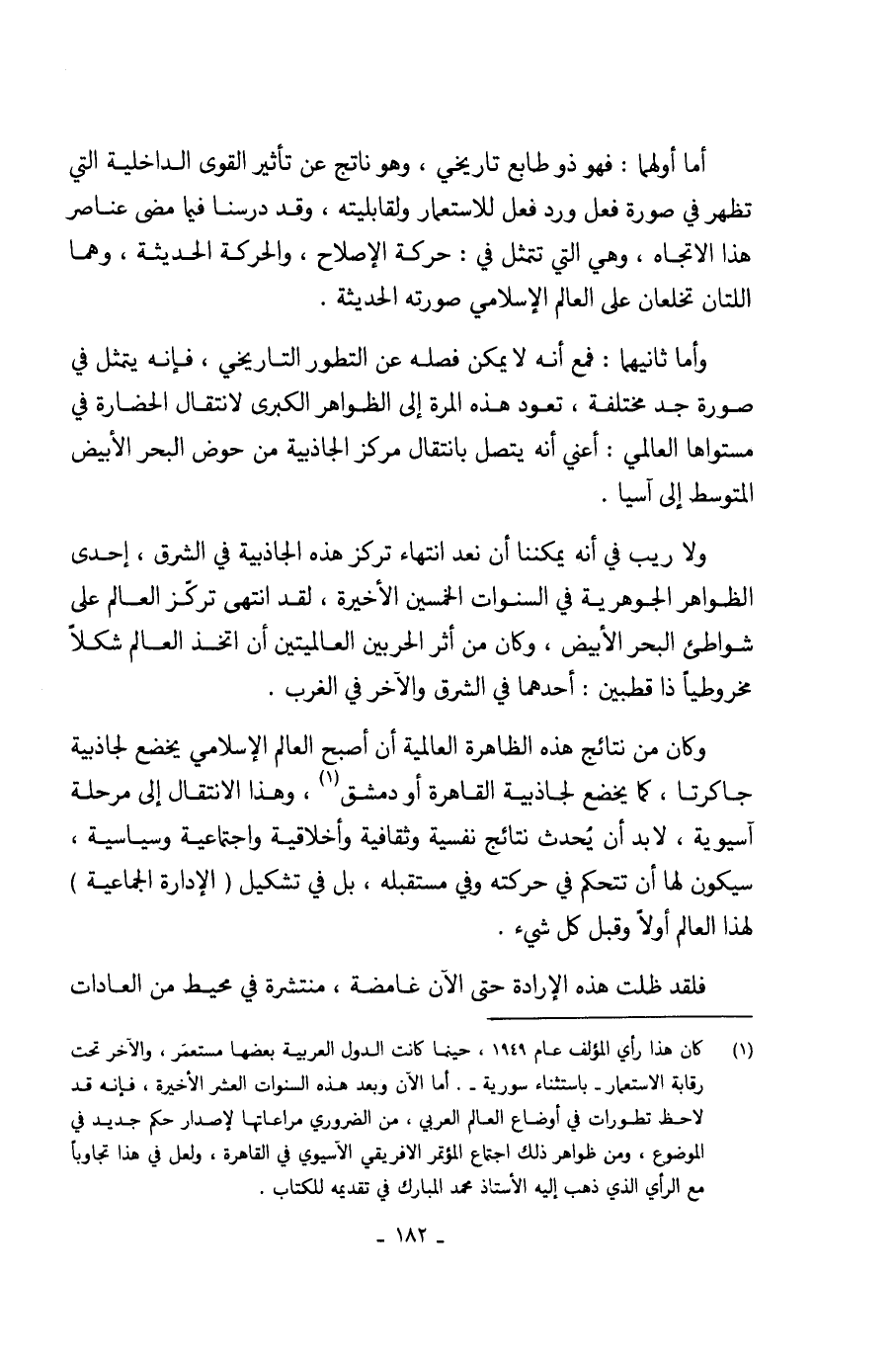 أما أولهما: فهو ذو طابع تاريخي، وهو ناتج عن تأثير القوى الداخلية التي تظهر في صورة فعل ورد فعل للاستعمار ولقابليته، وقد درسنا فيما مضى عناصر هذا الاتجاه، وهي التي تتمثل في: حركة الإصلاح، والحركة الحديثة، وهما اللتان تخلعان على العالم الإسلامي صورته الحديثة.