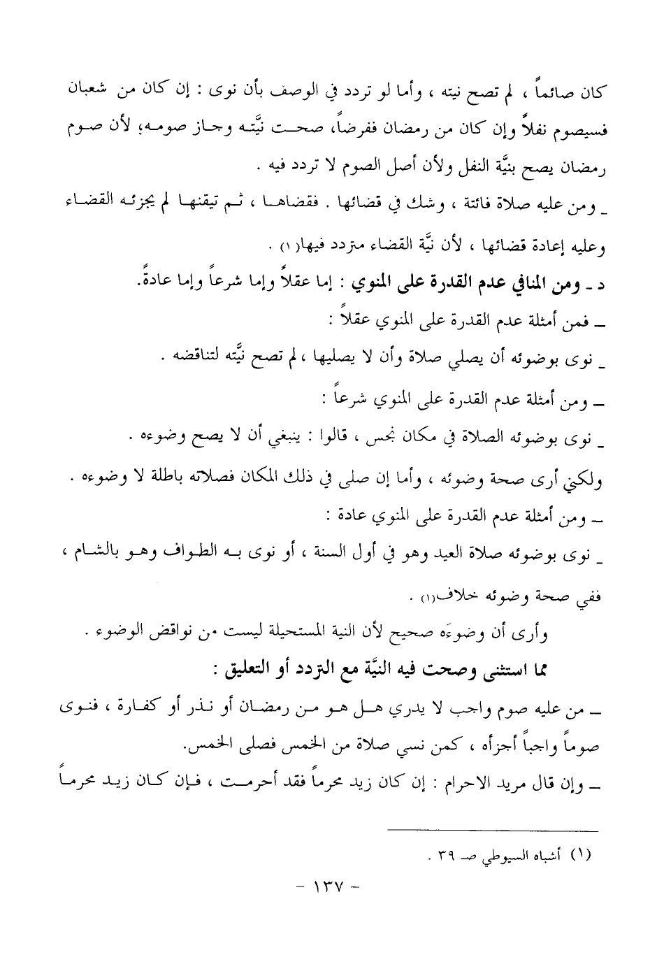(د) ومن المنافي عدم القدرة على المنوي: إما عقلاً وإما شرعاً وإما عادةً.