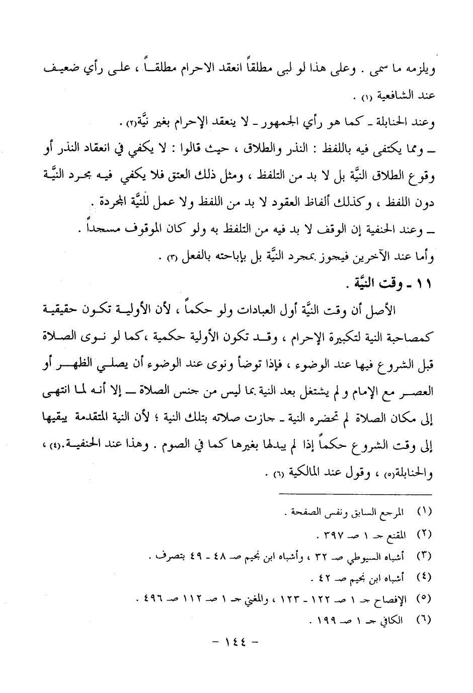 الأصل أن وقت النية أول العبادات ولو حكماً، لأن الأولية تكون حقيقية كمصاحبة النية لتكبيرة الإحرام، وقد تكون الأولية حكمية، كما لو نوى الصلاة قبل الشروع فيها عند الوضوء، فإذا توضأ ونوى عند الوضوء أن يصلي الظهر أو العصر مع الإمام ولم يشتغل بعد النية بما ليس من جنس الصلاة، إلا أنه لما انتهى إلى مكان الصلاة لم تحضره النية جازت صلاته بتلك النية؛ لأن النية المتقدمة يبقيها إلى وقت الشروع حكماً إذا لم يبدلها بغيرها كما في الصوم، وهذا عند الحنفية، والحنابلة، وقول عند المالكية.