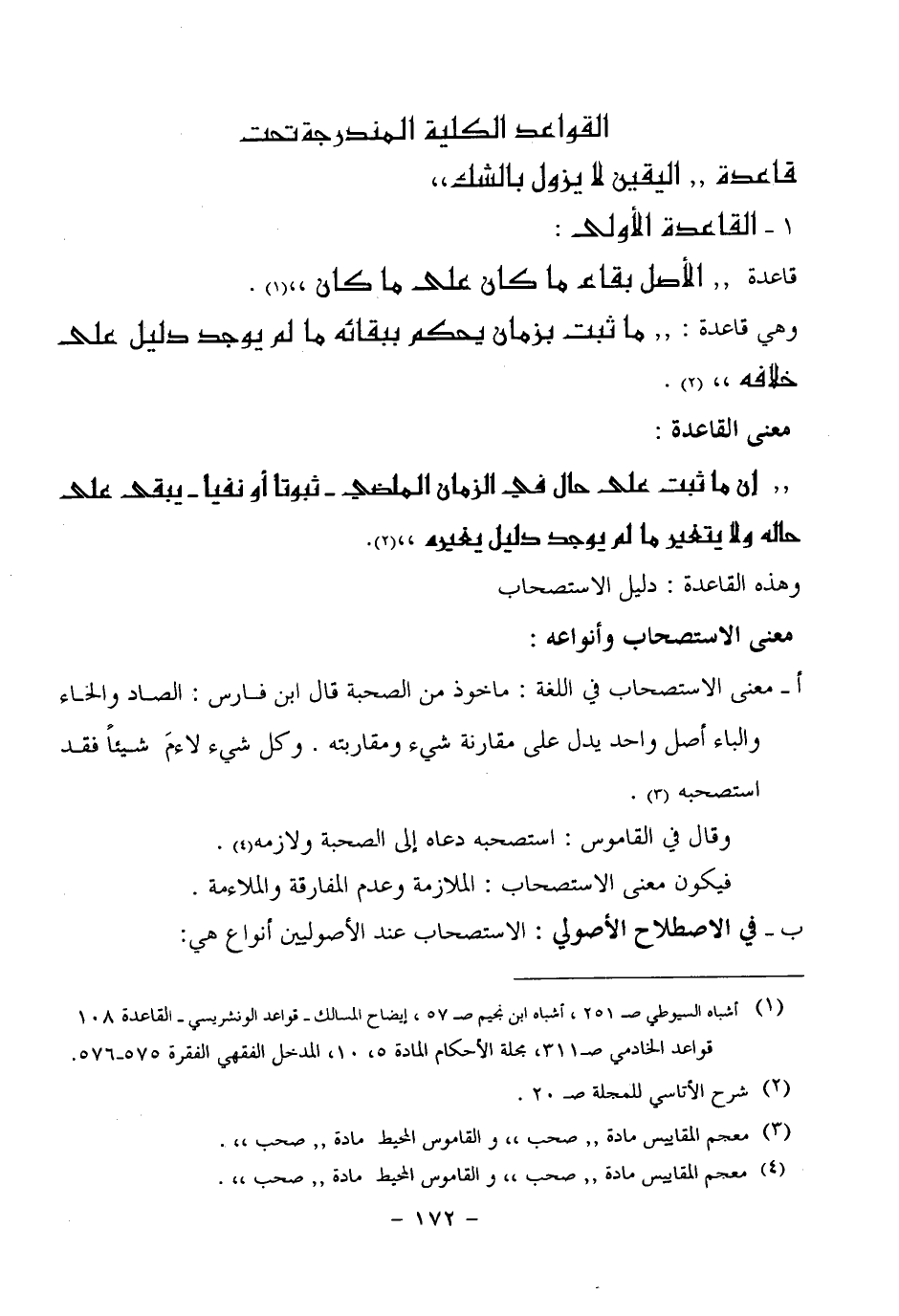 (أن ما ثبت على حال في الزمان الماضي، ثبوتاً أو نفياً، يبقى على حاله ولا يتغير ما لم يوجد دليل يغيره) .