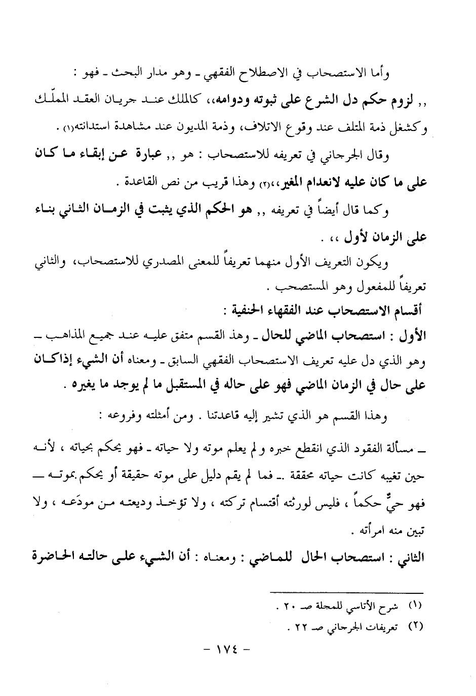 وقال الجرجاني في تعريفه لاستصحاب: هو عبارة عن إبقاء ما كان على ما كان عليه لانعدام المغير) وهذا قريب من نص القاعدة.