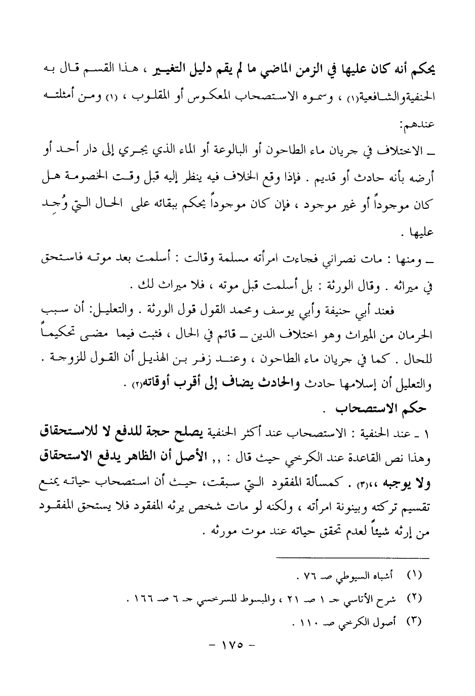 ١. عند الحنفية: الاستصحاب عند أكثر الحنفية يصلح حجة للدفع لا للاستحقاق وهذا نص القاعدة عند الكرخي حيث قال: (الأصل أن الظاهر يدفع الاستحقاق ولا يوجبه) كمسألة المفقود التي سبقت، حيث أن استصحاب حياته يمنع تقسيم تركته وبينونة امرأته، ولكنه لو مات شخص يرثه المفقود فلا يستحق المفقود من إرثه شيئاً لعدم تحقق حياته عند موته مورثه.