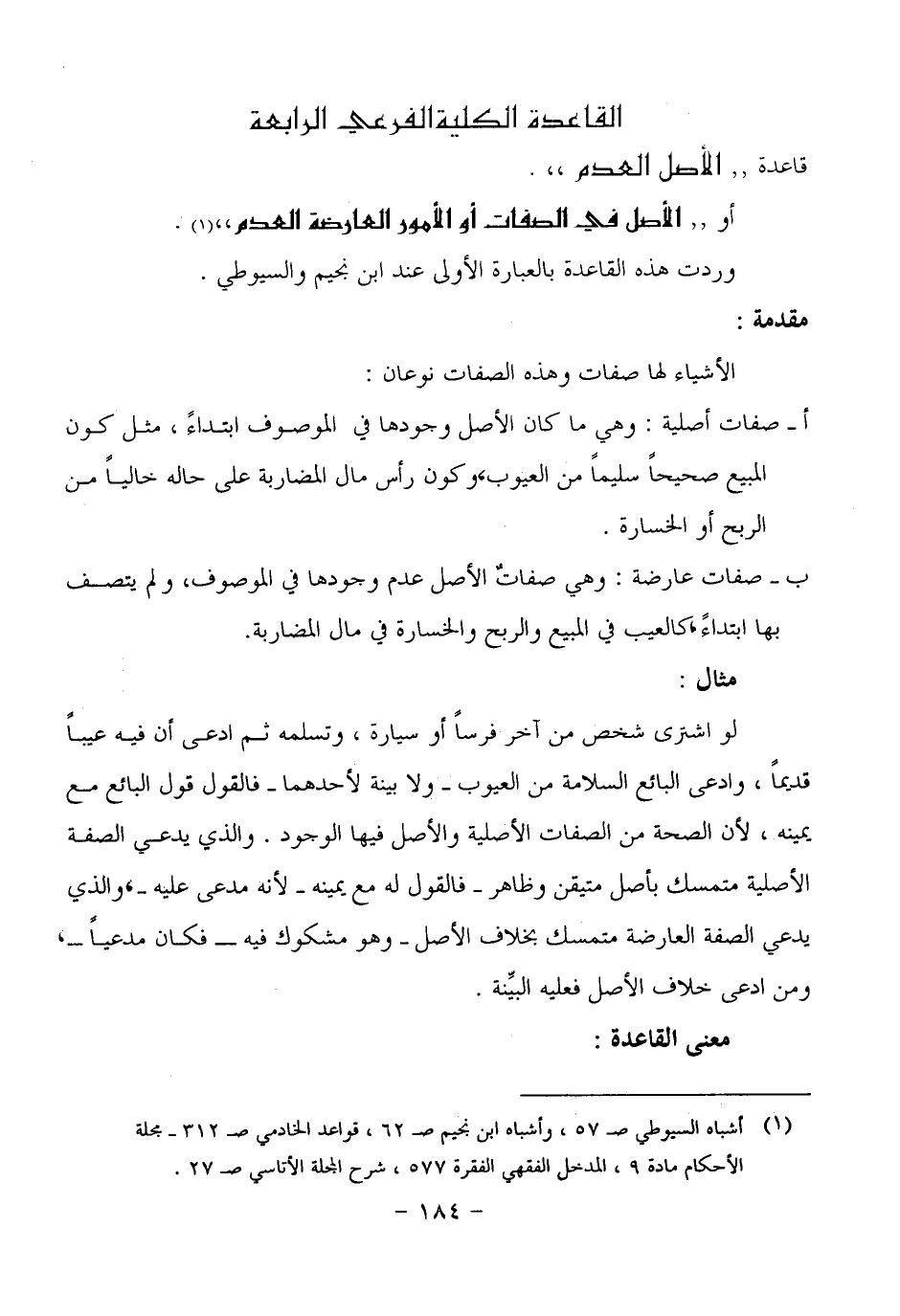 مثال: لو اشترى شخص من آخر فرساً أو سيارة، وتسلمه ثم ادعى أن فيه عيباً قديماً، وادعى البائع السلامة من العيوب، ولا بينة لأحدهما فالقول قول البائع مع يمينه، لأن الصحة من الصفات الأصلية والأصل فيها الوجود، والذي يدعي الصفة الأصلية متمسك بأصل متيقن وظاهر، فالقول له مع يمينه لأنه مدعى عليه، والذي يدعي الصفة العارضة متمسك بخلاف الأصل وهو مشكوك فيه فكان مدعياً، ومن ادعى خلاف الأصل فعليه البيِّنة.
