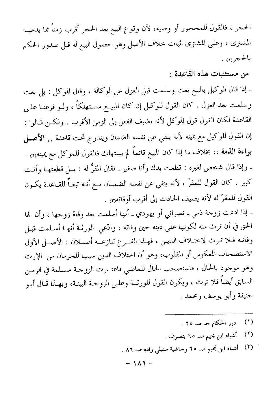 إذا قال الوكيل بالبيع بعت وسلمت قبل العزل عن الوكالة، وقال الموكل: بل بعت وسلمت بعد العزل، كان القول للوكيل إن كان المبيع مستهلكاً، ولو فرعنا على القاعدة لكان القول قول الموكل لأنه يضيف الفعل إلى الزمن الأقرب، ولكن قالوا: إن القول للوكيل مع يمينه لأنه ينفي عن نفسه الضمان ويندرج تحت قاعدة (الأصل براءة الذمة) بخلاف ما إذا كان المبيع قائماً لم يستهلك فالقول للموكل مع يمينه.