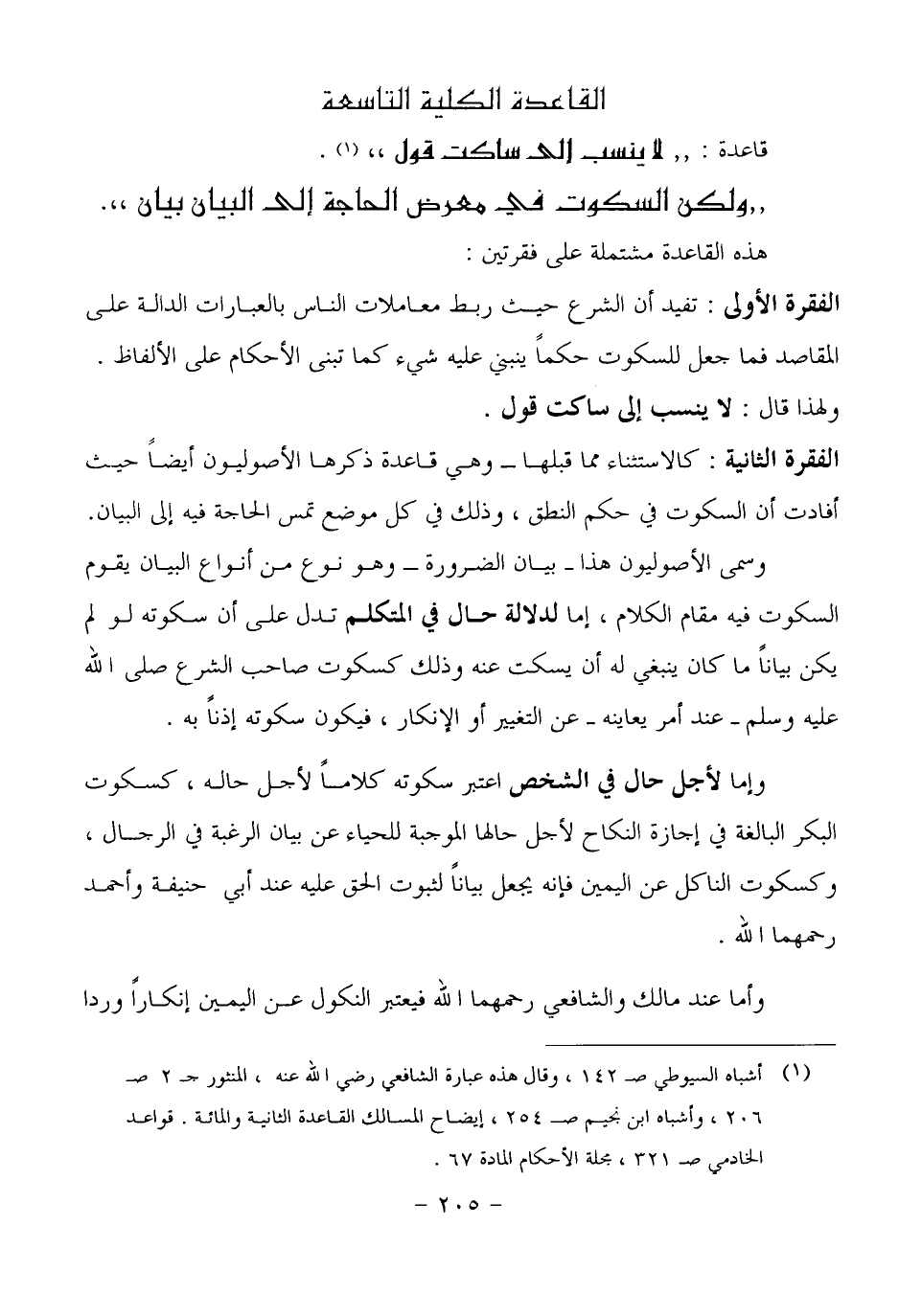 الفقرة الأولى: تفيد أن الشرع حيث ربط معاملات الناس بالعبارات الدالة على المقاصد فما جعل للسكوت حكماً ينبني عليه شيء كما تبنى الأحكام على الألفاظ.