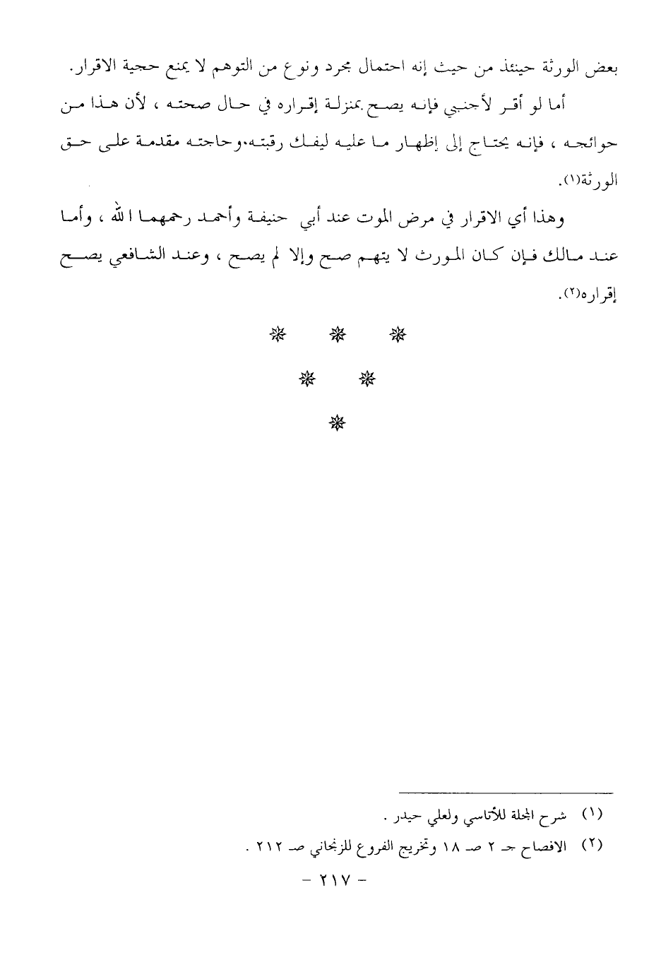 وهذا أي الإقرار في مرض الموت عند أبي حنيفة وأحمد رحمهما الله، وأما عند مالك فإن كان المورث لا يتهم صح وإلا لم يصح، وعند الشافعي يصح إقراره.