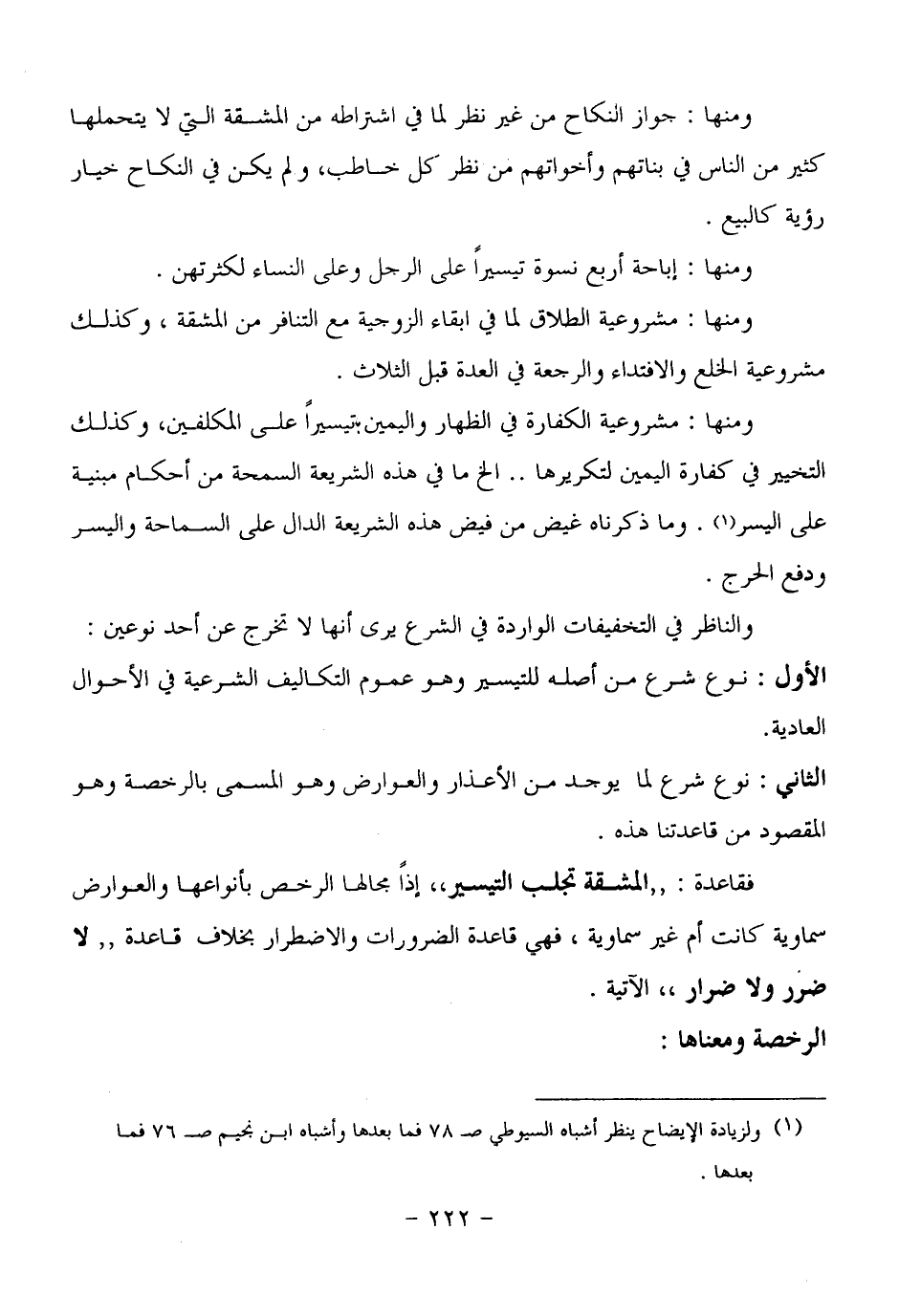 ومنها: مشروعية الكفارة في الظهار واليمين تيسيراً على المكلفين، وكذلك التخيير في كفارة اليمين لتكريرها، إلخ ما في هذه الشريعة السمحة من أحكام مبنية على اليسر، وما ذكرناه غيض من فيض هذه الشريعة الدال على السماحة واليسر ودفع الحرج.