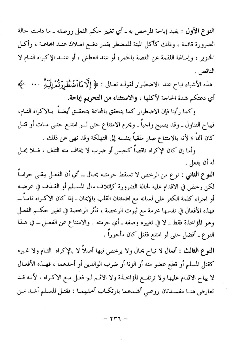 النوع الثاني: نوع من الرخص لا تسقط حرمته بحال أي أن الفعل يبقى حراماً لكن رخص في الإقدام عليه لحالة الضرورة كإتلاف مال المسلم أو القذف في عرضه أو إجراء كلمة الكفر على لسانه مع اطمئنان القلب بالإيمان (إذا كان الإكراه تاماً) فهذه الأفعال في نفسها محرمة مع ثبوت الرخصة، فأثر الرخصة في تغيير حكم الفعل وهو المؤاخذة فقط (لا في تغييره وصفه أي حرمته، والامتناع عن الفعل) في هذا النوع أفضل حتى لو امتنع فقتل كان مأجوراً.