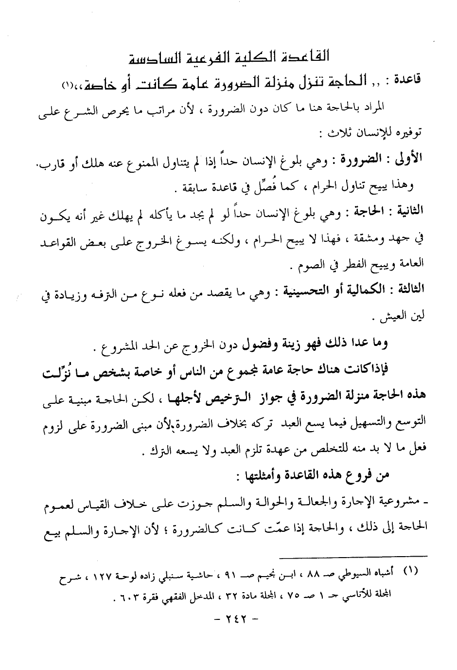 المراد بالحاجة هنا ما كان دون الضرورة، لأن مراتب ما يحرص الشرع على توفيره للإنسان ثلاث: