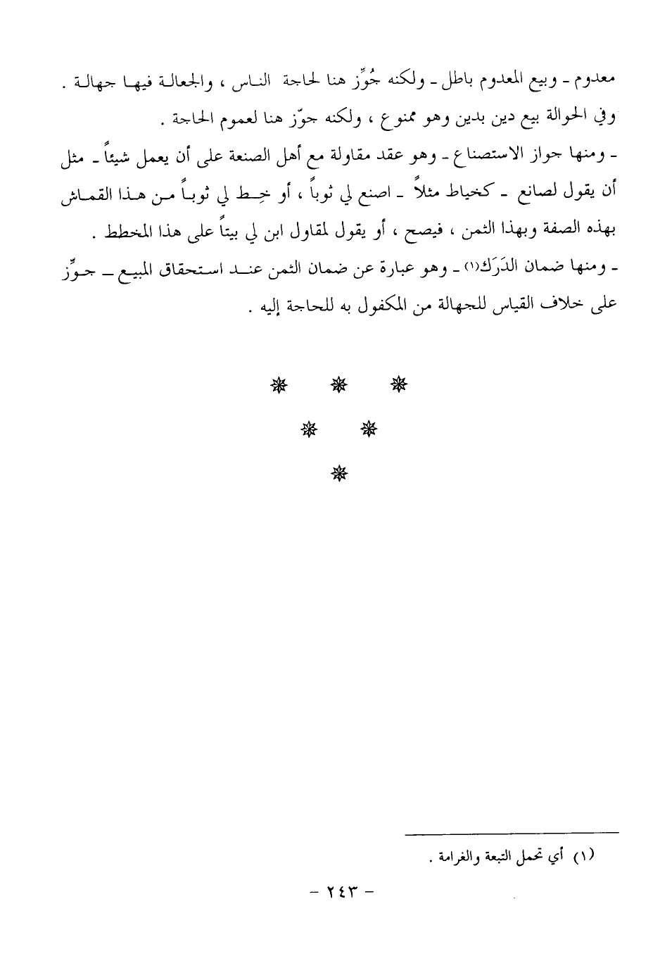ومنها ضمان الدَرَك وهو عبارة عن ضمان الثمن عند استحقاق المبيع، جوِّز على خلاف القياس للجهالة من المكفول به للحاجة إليه.