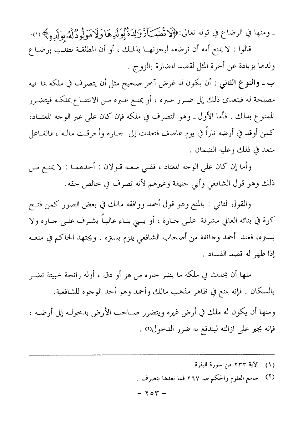 (ب) والنوع الثاني: أن يكون له غرض آخر صحيح مثل أن يتصرف في ملكه بما فيه مصلحة له فيتعدى ذلك إلى ضرر غيره، أو يمنع غيره من الانتفاع بملكه فيتضرر الممنوع بذلك، فأما الأول وهو التصرف في ملكه فإن كان على غير الوجه المعتاد، كمن أوقد في أرضه ناراً في يوم عاصف فتعدت إلى جاره وأحرقت ماله، فالفاعل متعد في ذلك وعليه الضمان.