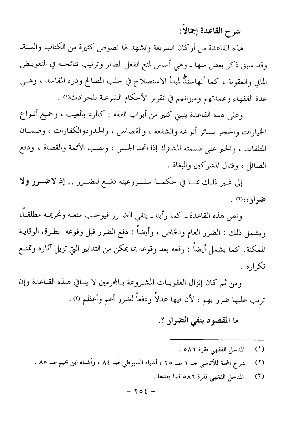 هذه القاعدة من أركان الشريعة وتشهد لها نصوص كثيرة من الكتاب والسنة، وقد سبق ذكر بعض منها، وهي أساس لمنع الفعل الضار وترتيب نتائجه في التعويض المالي والعقوبة، كما أنها سند لمبدأ الاستصلاح في جلب المصالح ودرء المفاسد، وهي عدة الفقهاء وعمدتهم وميزانهم في تقرير الأحكام الشرعية للحوادث.