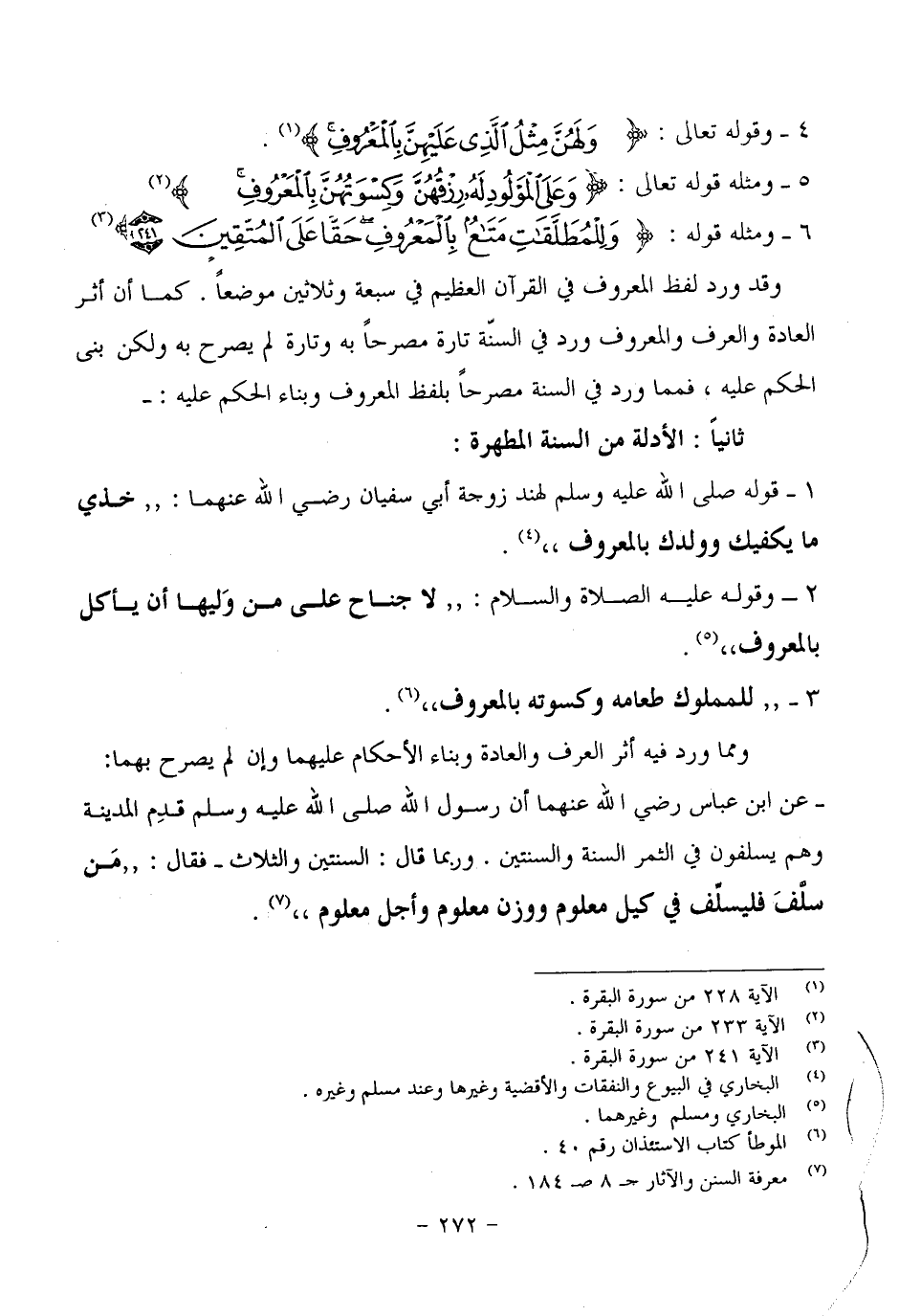 ١. قوله صلى الله عليه وسلم لهند زوجه أبي سفيان رضي الله عنهما: (خذي ما يكفيك وولدك بالمعروف) . البخاري في البيوع والنفقات والأقضية وغيرها وعند مسلم وغيره.