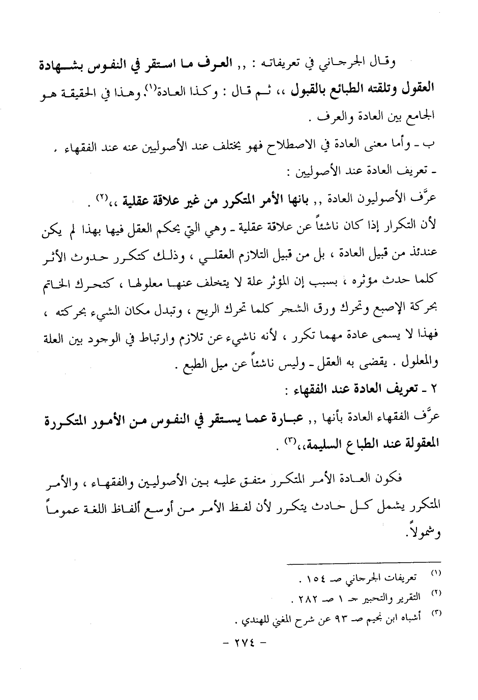 وقال الجرجاني في تعريفاته: (العرف ما استقر في النفوس بشهادة العقول وتلقته الطبائع بالقبول) ثم قال: (وكذا العادة، وهذا في الحقيقة هو الجامع بين العادة والعرف.