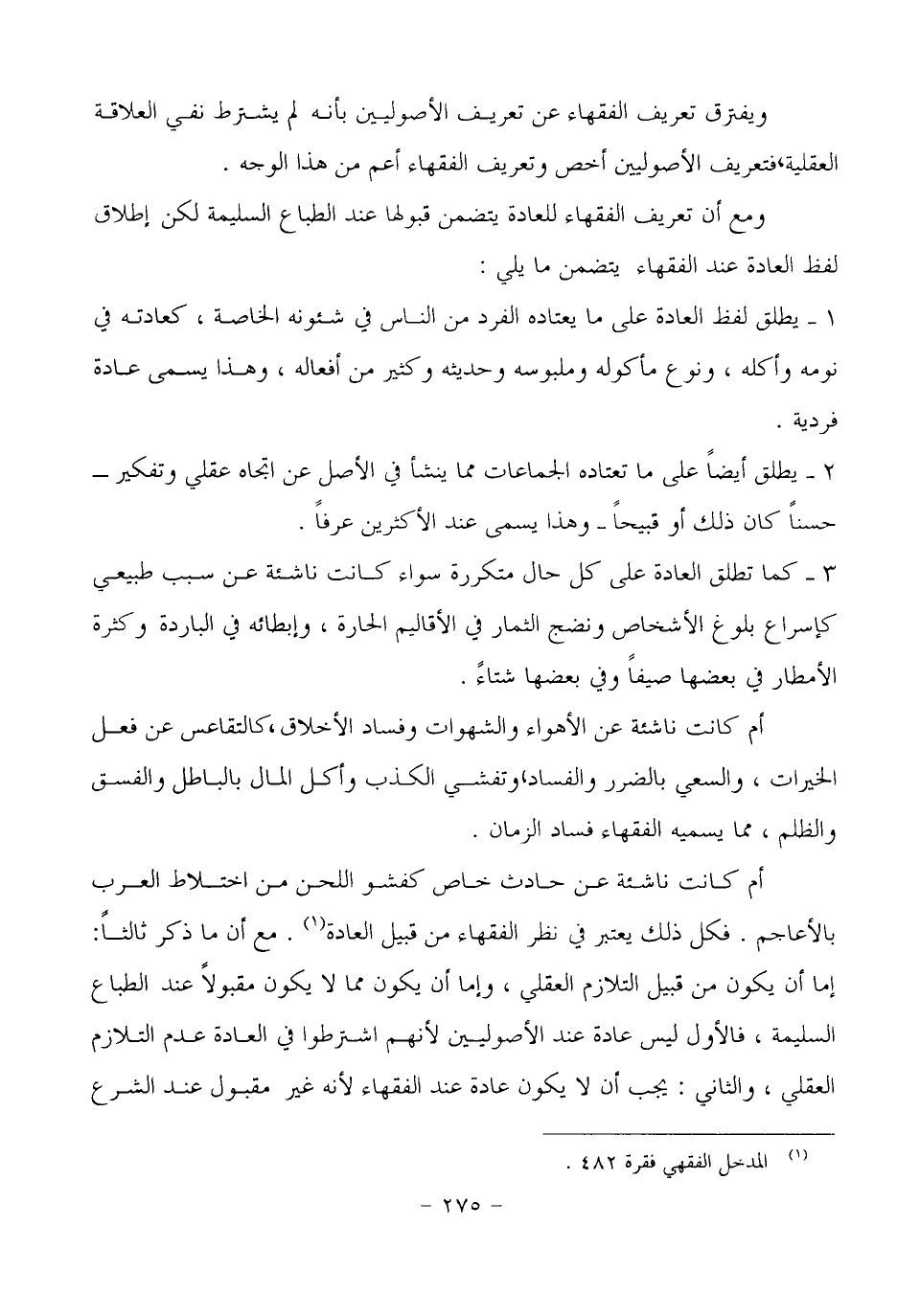 أم كانت ناشئة عن حادث خاص كفشو اللحن من اختلاط العرب بالأعاجم، فكل ذلك يعتبر في نظر الفقهاء من قبيل العادة، مع أن ما ذكر ثالثاً: إما أن يكون من قيل التلازم العقلي، وإما أن يكون مما لا يكون مقبولاً عند الطباع السليمة، فالأول ليس عادة عند الأصوليين لأنهم اشترطوا في العادة عدم التلازم العقلي، والثاني: يجب أن لا يكون عادة عند الفقهاء لأنه غير مقبول عند الشرع