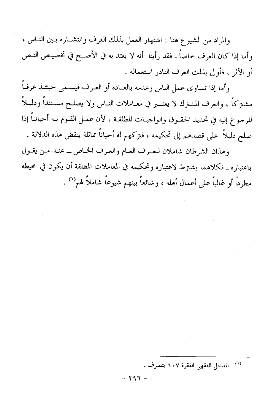 وأما إذا تساوى عمل الناس وعدمه بالعادة أو العرف فيسمى حينئذ عرفاً مشتركاً، والعرف المشترك لا يعتبر في معاملات الناس ولا يصلح مستنداً ودليلاً للرجوع إليه في تحديد الحقوق والواجبات المطلقة، لأن عمل القوم به أحياناً إذا صلح دليلاً على قصدهم إلى تحكيمه، فتركهم له أحياناً مماثلة ينقض هذه الدلالة.