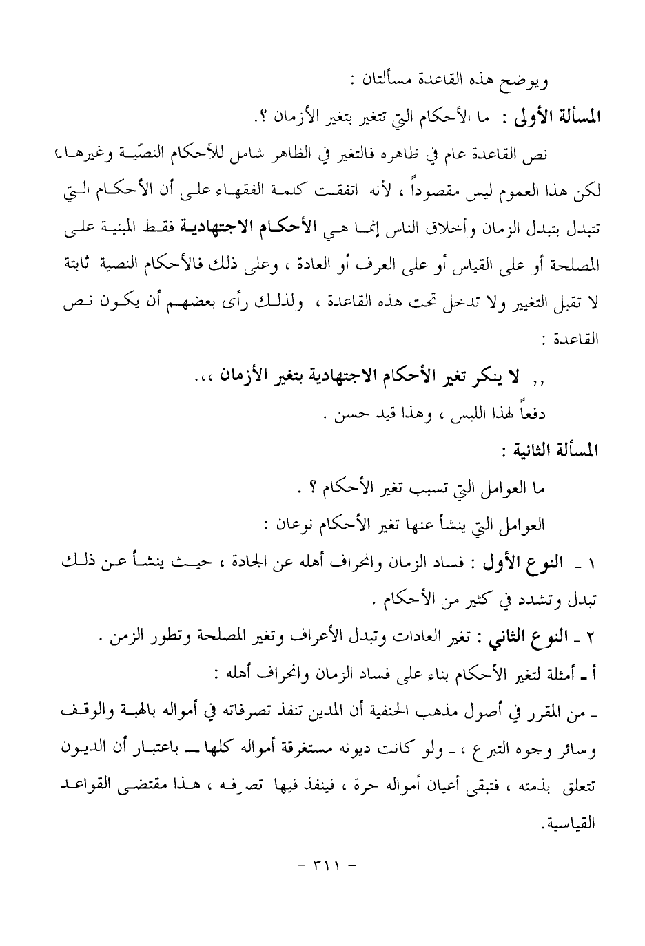 (لا ينكر تغير الأحكام الاجتهادية بتغير الأزمان) .