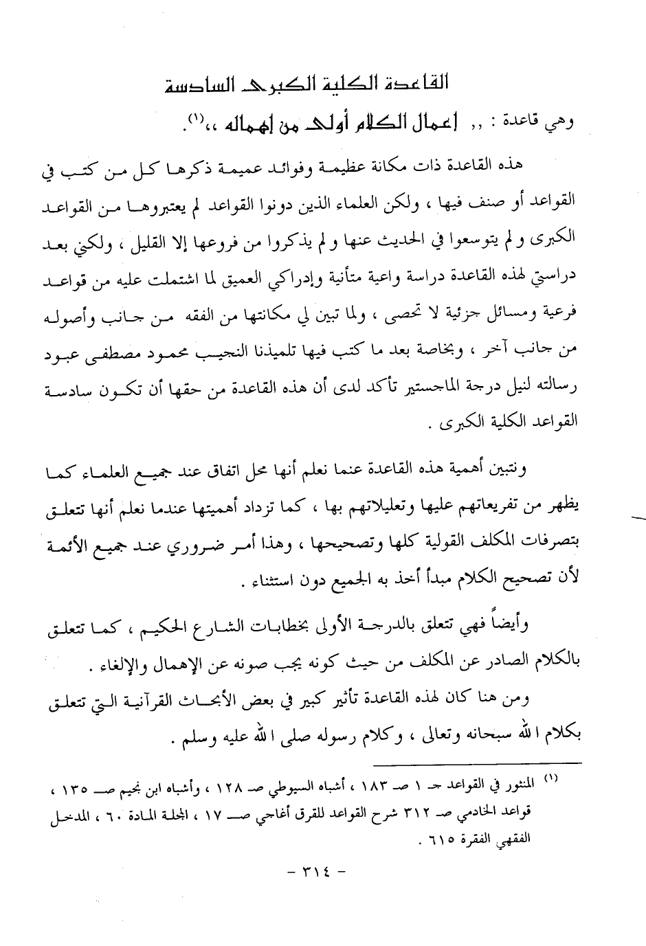 هذه القاعدة ذات مكانة عظيمة وفوائد عميمة ذكرها كل من كتب في القواعد أو صنف فيها، ولكن العلماء الذين دونوا القواعد لم يعتبروها من القواعد الكبرى ولم يتوسعوا في الحديث عنها ولم يذكروا في فروعها إلا القليل، ولكني بعد دراستي لهذه القاعدة دراسة واعية متأنية وإدراكي العميق لما اشتملت عليه من قواعد فرعية ومسائل جزئية لا تحصى، ولما تبين لي مكانتها من الفقه من جانب وأصوله من جانب آخر، وبخاصة بعد ما كتب فيها تلميذنا النجيب محمود مصطفى عبود رسالته لنيل درجة الماجستير تأكد لدي أن هذه القاعدة من حقها أن تكون سادسة القواعد الكلية الكبرى.