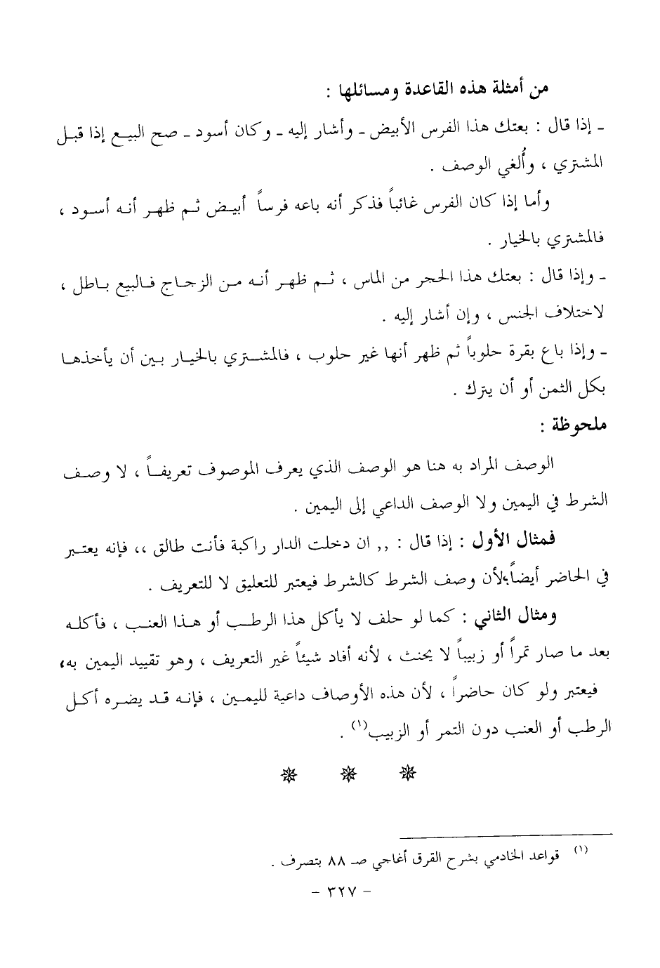 ومثال الثاني: كما لو حلف لا يأكل هذا الرطب أو هذا العنب، فأكله بعد ما صار تمراً أو زبيباً لا يحنث، لأنه أفاد شيئاً غير التعريف، وهو تقييد اليمين به، فيعتبر ولو كان حاضراً، لأن هذه الأوصاف داعية لليمين، فإنه قد يضره أكل الرطب أو العنب دون التمر أو الزبيب.